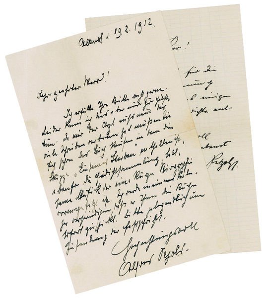 Zusammen (1+¾ =) 1¾ SS. auf 4 (= 2 Doppel-)Blatt. Gr.-8vo. Jeweils mit eh. adr. Kuvert. Mit zwei Beilagen (s. u.). An den Schriftsteller Philipp Munk (1892-1920): "Ich erfülle Ihre Bite recht gerne. Leider kann ich dies aber nur zur Hälfte tun. Da mir der Arzt aufs neue das viele Schreiben verboten hat müssen Sie sich schon das Buch kaufen in dem die Skizze 'Einsames Sterben' enthalten ist, ebenso die Gedichtsamlung 'Seltsame Musik['] der eine kurze Biographie vorangesetzt ist. Ich werde meinen Verleger verständigen, daß er Ihnen die Bücher sofort zuschickt [.]" (Br. v. 19. II. 1912 aus Alland; mit kleinen Einrissen im Mittelfalz und einem kleinen Randausriß). - Der Brief vom 10. I. 1920 aus Kitzbühel mit "Dank für die Widmung Ihres Versbuch[es]". - Alfons Petzold schrieb vor seiner Begegnung mit Joseph Luitpold Stern vorwiegend Couplets und kleinere dramatische Arbeiten, veröffentlichte mit dessen Hilfe 1910 den Gedichtband "Trotz alledem!" und wurde mit seinem Werk zum Wegbereiter der österreichischen sozialistischen Literatur. Mit Freunden gemeinsam gründete Petzold den Ikarus-Bund, veröffentlichte Gedichte in anarchistischen Zeitschriften und war mit Franz Karl Ginzkey befreundet; 1917 übersiedelte er nach Kitzbühel und war hier bis zu seinem Tod als Funktionär der Sozialdemokratischen Partei tätig. - Beiliegend ein Liefer- sowie ein Empfangsschein der Antiquariatsbuchhandlung Brüder Suschitzky.