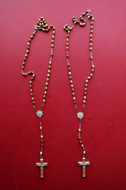 Due rosari con piccola reliquia, Due rosari fabbricati in legno d'ulivo con una piccola reliquia che consiste in un frammento di terra della Terra Santa di Gerusalemme S. d.; 2 rosari in legno d'ulivo, corredati con piccola reliquia come indicato sopra (vedi foto). Dimensioni: lunghezza cm 43. Condizioni di conservazione Entrambi molto ben conservati con leggere tracce d'uso. Per ulteriori dettagli vedi foto. SC04.D0545 N
