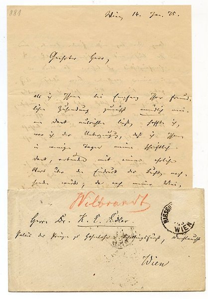 Zusammen (3½+1+1 =) 5½ SS. auf 5 Bll. Gr.-8vo. Mit einem eh. adr. Kuvert. An den Schriftsteller Karl Erdmann Edler (1844-1931) mit einem Urteil über dessen literarische Arbeiten (Br. v. 14. I. 1875), betr. des Abdrucks einer Novelle von L. Herbst (Br. v. 30. III. 1880) und in Beantwortung von dessen Anfrage: "Ihre Aufforderung trifft bei mir den allerungünstigsten Boden: zu meiner Lebensphilosophie gehört, der Miseren des Dramatikerlebens so wenig wie möglich zu gedenken [.]" (Br. v. 11. XII. 1904). - Geboren in Rostock, lebte Wilbrandt als freier Schriftsteller in Berlin, Frankfurt a. M., Rom und München, ehe er 1871 nach Wien kam. Von 1881-87 war Wilbrandt, der zu den "meistgespielten Autoren der Zeit" (DBE) gehörte, als Direktor des Wiener Hofburgtheaters maßgeblich an der Wiederentdeckung griechischer Dramen für das deutschsprachige Theater beteiligt. - Karl Frh. von Haerdtl war Mitglied des Herrenhauses und mehr als zwanzig Jahre lang Präsident der Wiener Advokatenkammer. - Leopold Rosner war Schauspieler in Preßburg und Wien und trat 1861 in die Wallishausersche Buchhandlung Josef Klemms in Wien ein, dessen "Wiener Theater-Repertoir" er redigierte. Daneben war er Mitarbeiter an Adolf Bäuerles "Theaterzeitung" und an Wurzbachs "Biographischem Lexikon". 1871 eröffnete er die Buchhandlung "Unter den Tuchlauben", die sich zu einem Treffpunkt literarischer Kreise entwickelte. Zugleich betrieb er einen Verlag, in dem vorwiegend österreichische Autoren wie Ludwig Anzengruber und Ferdinand Kürnberger erschienen; seit 1872 gab Rosner die Reihe "Neues Wiener Theater" heraus. "1889 zog er sich aus gesundheitlichen Gründen aus dem Verlagsgeschäft zurück und widmete sich ausschließlich schriftstellerischer Arbeit [und] trat als Übersetzer, Erzähler und Feuilletonist hervor" (DBE). - K. E. Edler war seit 1864 Erzieher in verschiedenen Adelshäusern, so etwa im Haus des Grafen Amadei sowie des Prinzen Hohenlohe, und von 1878 bis 1890 Professor der Poetik, Mythologie und Geschichte der Schauspielkunst am Wiener Konservatorium. "Er schrieb nach dem Vorbild des Münchner Dichterkreises und verfaßte Novellen und Erzählungen, u. a. 'Notre Dame des Flots. Eine Glocknerfahrt' (1882)" (DBE). - Tls. mit alt hinterlegten Einrissen und kleinen Läsuren.