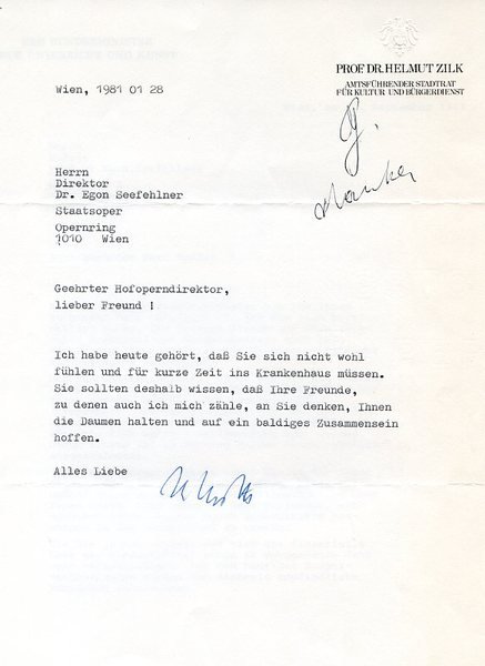Zusammen 3 SS. auf 4 Bll. Gr.-4to. An Staatsoperndirektor Egon Seefehlner (1912-97) mit Wünschen für eine baldige Genesung (1981), betr. der einvernehmlichen Auflösung von Seefehlners Dienstvertrag (1983) und mit Dank für die Gratulation "zu meiner Wahl zum Bürgermeister der Stadt Wien" (1984). - Jeweils auf Briefpapier mit gedr. Briefkopf und im linken Rand gelocht (keine Textberührung).