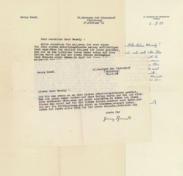 Zusammen 3 SS. 4to und 8vo. Mit 3 (1 eh. und 2 ms.) Kuverts. Dankt Josef Wesely für ihm wiederholt übersandte Wünsche zum Geburtstag: “Wir [d. i. er und seine Gattin] haben sehr viel gearbeitet, besonders im vergangenen Jahr, weil doch immer viel nachzuholen ist und weil sich die Verhältnisse im Verlagswesen noch immer nicht so richtig konsolidiert haben. Man wußte nicht recht, wer lebensfähig sein würde, und so war alles nur ein Tasten [.]” (Br. v. 27. II. 1951). - Georg Rendl bewirtschaftete seit 1920 eine Bienenfarm, ging 1923 nach Jugoslawien und betätigte sich nach seiner Rückkehr als Bergwerks-, Hütten- und Bahnarbeiter und Glasbläser. Seit 1931 veröffentlichte er Erzählungen, Romane, religiöse Dramen, Hörspiele, Laienspiele und Jugendbücher, in denen sich seine Biographie widerspiegelt; 1951 wurde dem zwischenzeitlich renommierten Schriftsteller der Professorentitel verliehen, im selben Jahr auch wurde er Ehrenbürger von St. Georgen, wo er seit 1938 mit seiner Gattin Bertha lebte. Neben Karl Heinrich Waggerl gilt Rendl als der bekannteste Schriftsteller seiner Zeit. Vgl. Kosch XII, 993f. - Der Br. v. 6. II. 1953 auf Briefpapier mit gedr. Briefkopf.