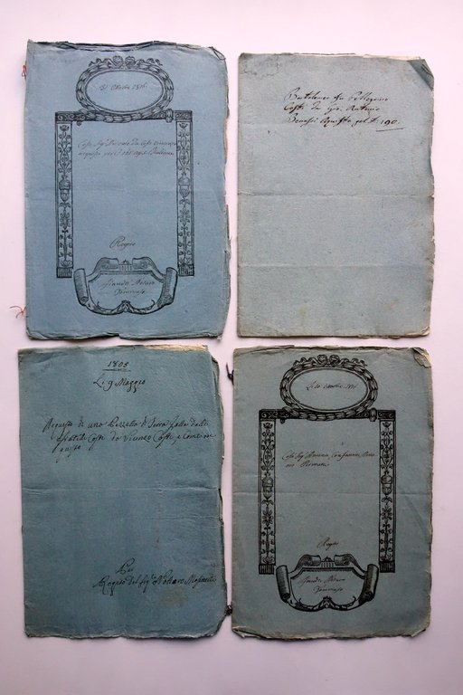4 rogiti - atti notarili privati, 4 atti notarili privati Prignano (provincia di Modena) per aquisto di terreni e per permuta Costi - Benassi - Fantini 1805-1826 4 atti notarili privati di cm 32x22, pp. non num. (pp. 4 per ciascun atto), con al termine del testo tabellonato notarile, sottoscrizione e firme per convalida. Carpetta d'epoca con breve regesto redatto a mano alla copertina. Condizioni di conservazione Buone condizioni con tracce d'uso e del tempo, leggere tracce di pieghe, alcune leggere bruniture, margini delle carpette con piccole / minime pieghette e pochi minuscoli strappetti; atto del 1792 con, alla carpetta, leggere ombre di gore che non interessano il testo. Interni buoni. SC03.D18678 N