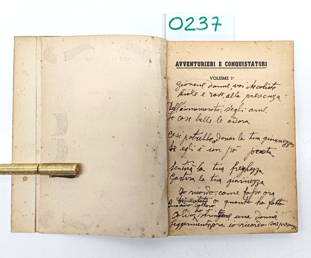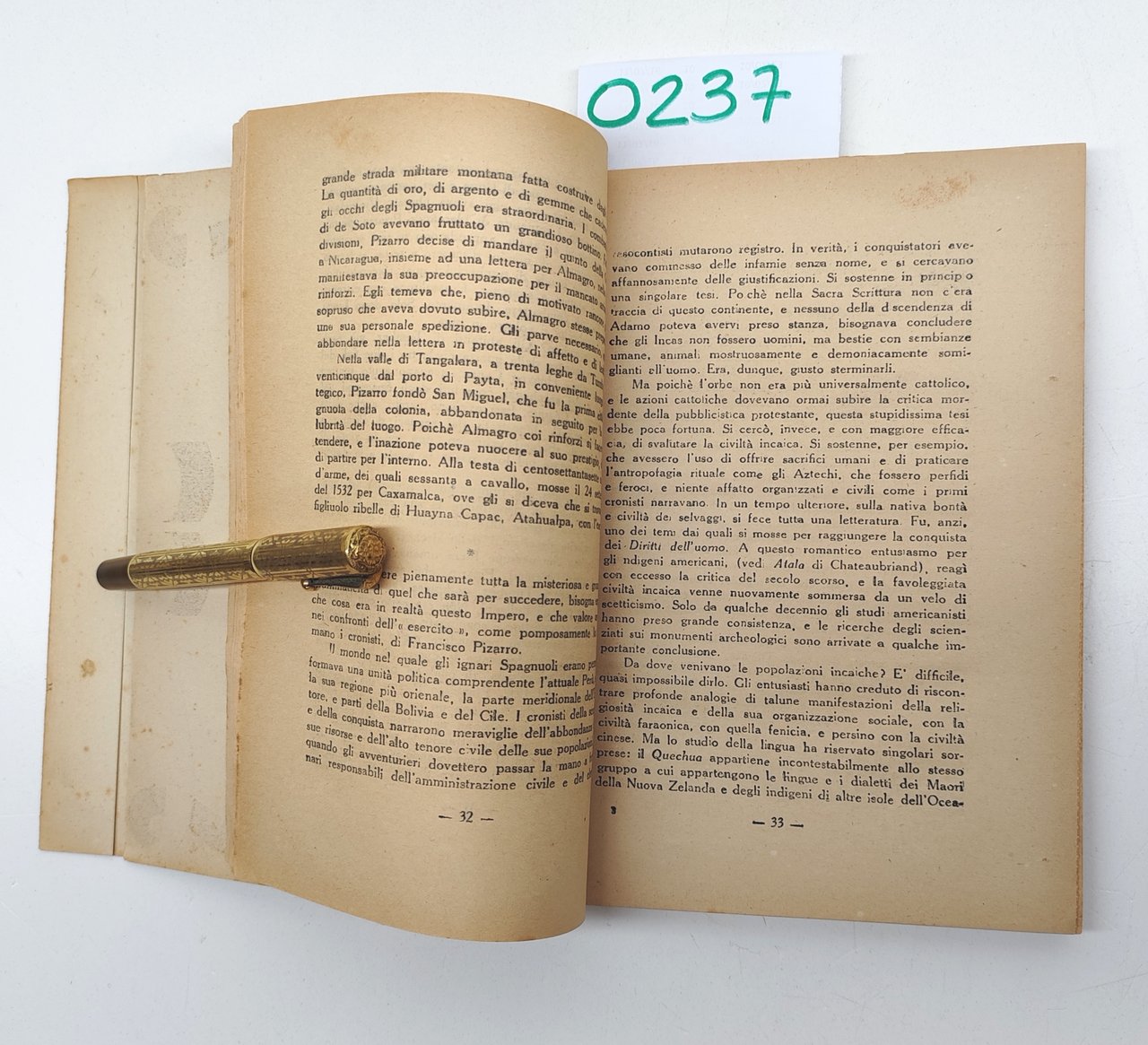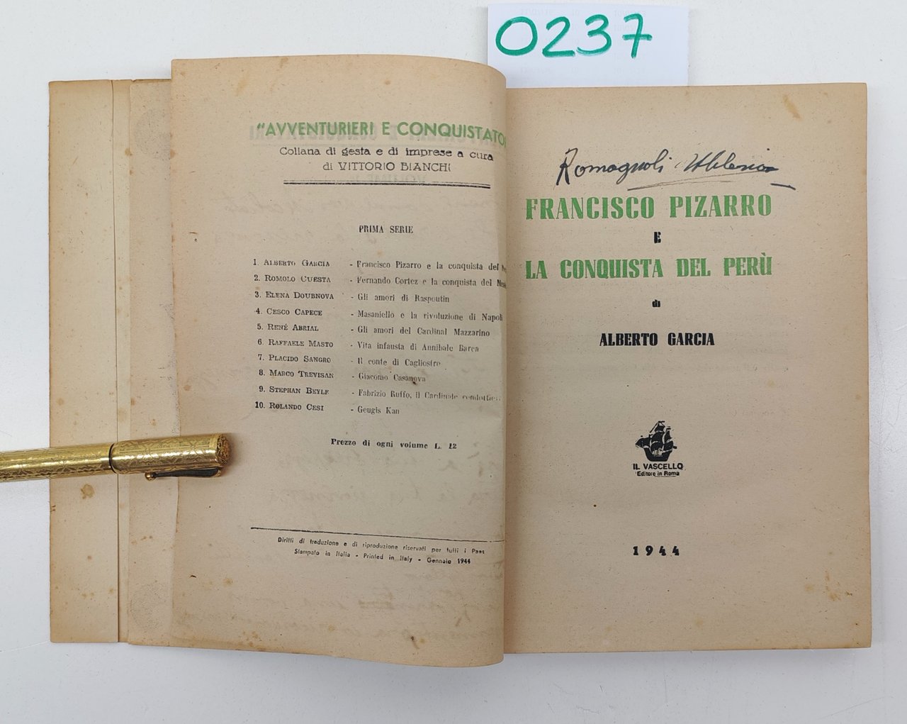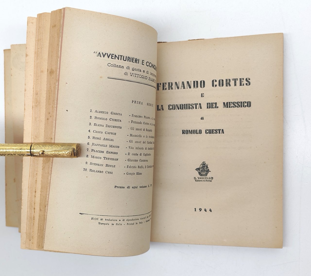 A. GARCIA R. CUESTA LA CONQUISTA DEL PERU' E DEL MESSICO 1944 IL VASCELLO SOVRACCOPERTA EDITORIALE SCIUPATA CON MANCANZE, LIBRO CONTENTE DUE VOLUMI IL PRIMO ALBERTO GARCIA FRANCISCO PIZARRO E LA CONQUISTA DEL PERŸ IL SECONDO ROMOLO QUESTA FERNANDO CORTES E LA CONQUISTA DEL MESSICO COPERTINA MORBIDA EDITORIALE INTERNO IN BUONO STATO CON ALCUNE MACCHIE E PIEGHE AGLI ANGOLI APPUNTI A PENNA NERA AI DUE FOGLI BIANCHI DEL LIBRO N. PAG. 78+77 CM. 14,5 X 20,5 VOLUMI SPILLATI, ALL'ANTIPORTA DEL PRIMO VOLUME SCRITTE A PENNA, AL FRONTESPIZIO FIRMA DI POSSESSO, NEL SECONDO VOLUME SCRITTA A PENNA ALL'ULTIMA PAGINA BIANCA E PAGINE INTERNE LEGGERMENTE BRUNITE