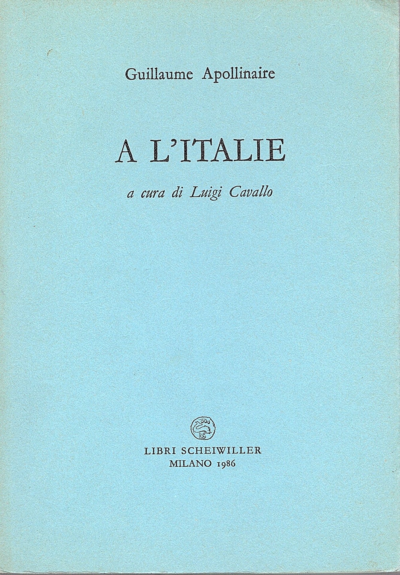 In-16°, pp. 75, (5), brossura editoriale azzurra a risvolti. Disegni b/n. Poesia, 1. Più che buon esemplare (n° 1040/1500). Prima edizione di questa rassegna di scritti di e su Apollinaire comprendenti l'edizione critica dell' Ode 'A l' Italie' basata sul manoscritto (ivi ripodotto in fac-simile).