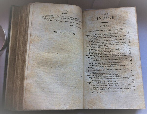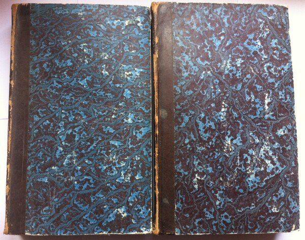 condizioni generali: Legatura in mezza pelle piatti rigidi marmorizzati sciupati e con alcune mancanze ai margini e ai piatti, dorso in pelle marrone con titoli e fregi in oro alcune mancanze ai margini e alle cerniere, tagli spruzzati, fogli di guardia bianchi con alcune lievi sporcizie, pagine interne con fioriture e bruniture, numero pagine 248 + 247 + 262 + 357 + 192