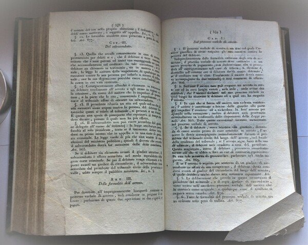 Primo volume: cerniera vista a pagina 3, una mancanza al margine inferiore esterno a pagina 19, un alone all'angolo inferiore, da pagina 59 a pagina 92, segni a matita al margine, da pagina 89 a pagina 121, un piccolo strappo al margine superiore esterno a pagina 143, segni al lato del testo alle pagine 187 e 188, da pagina 169 a pagina 194 una piega all'angolo inferiore, pagina 127 del secondo tomo con margine esterno irregolare sporgente ai tagli, pagina 247 (indice del secondo volume) con uno strappo di cm 9,5,