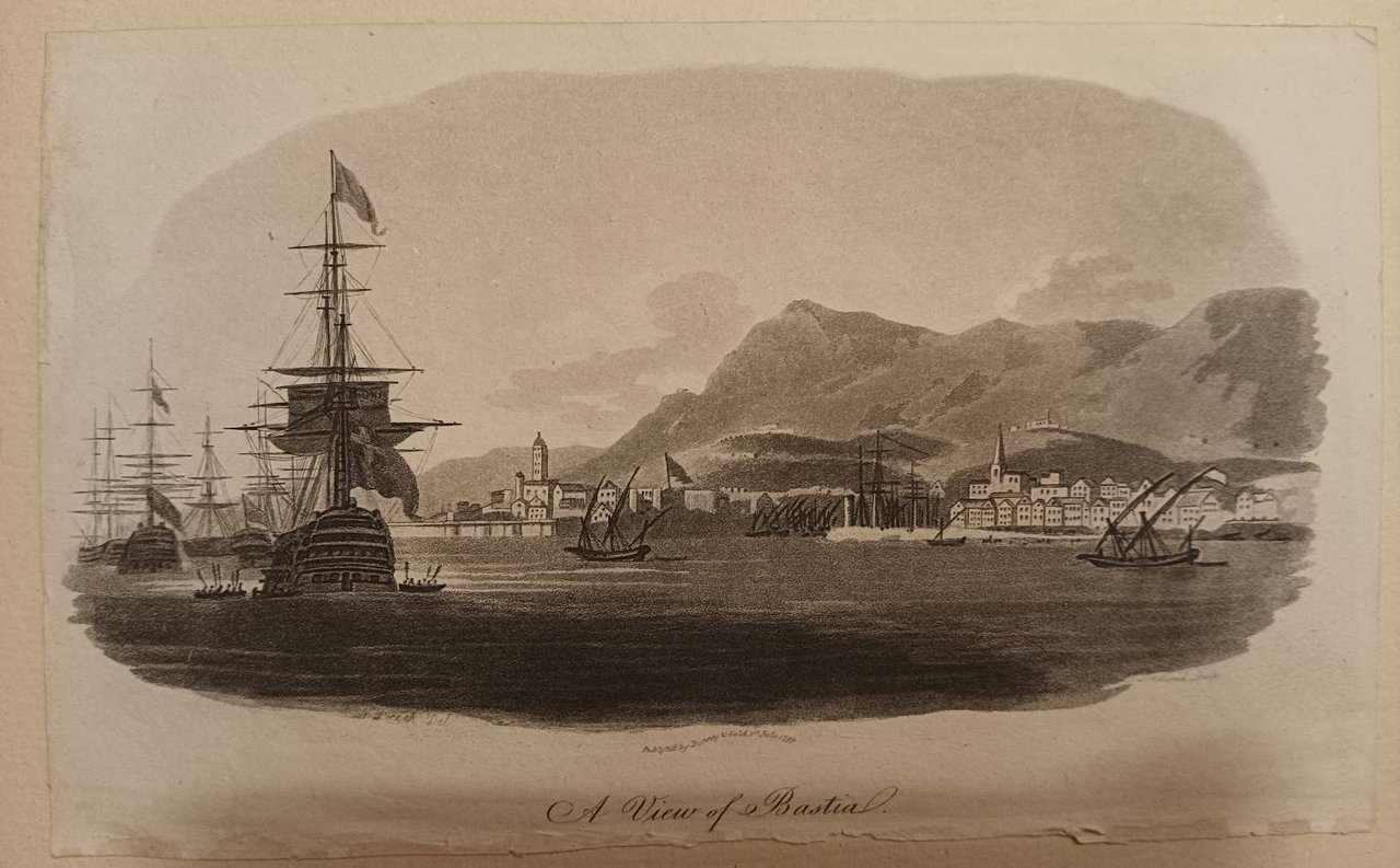 >Acquatinta originale (mm 142 x 235), disegnata da Nicholas Pocock (1740-1821), artista inglese, noto per i suoi numerosi dipinti dettagliati di battaglie navali, inciso da J. Medland. La medesima immagine è presente nel libro "1797 Nelson's Year of Destiny" di Colin White, a rappresentazione della conquista della Corsica ad opera degli Inglesi. A sinistra, l'ammiraglia di Lord Hood, al largo di Bastia, nel 1794, dopo la conquistra dell'isola. La città divenne sede del viceré Sir Gilbert Elliot. Esemplare in buono stato.