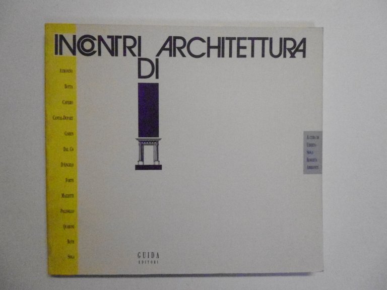 AA VV, (a cura di U. Siola e R. Amirante) Incontri di Architettura Guida Editori, Napoli, 1987; cm 24,5x22; pp. 144; ill. f. t. a col. e in b. n. Cartoncino edit. fig. a col. Condizioni di conservazione Esemplare in ottime condizioni. Quasi allo stato di nuovo. Lievissimo ingiallimento ai margini delle pagine interne. SETT19.L22777G