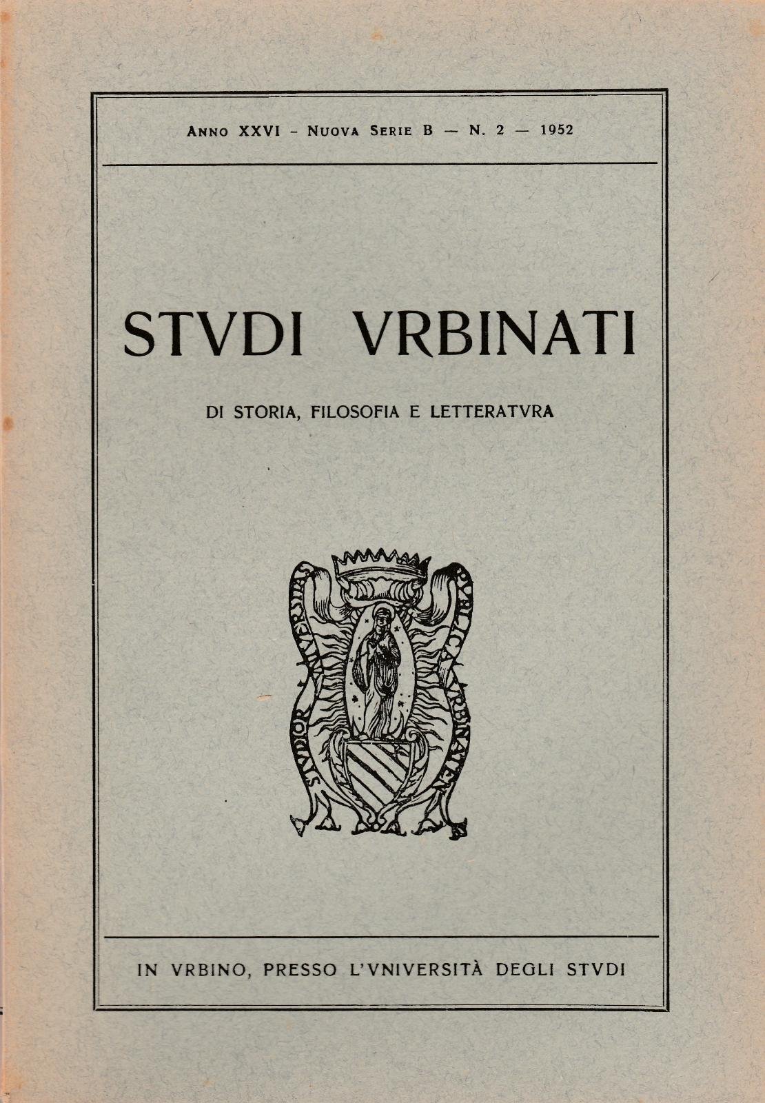 AA.VV. ANNO XXVI NUOVA SERIE N. 2 1952 STUDI URBINATI DI STORIA FILOSOFIA LETTERATURA IN URBINO PRESSO UNIVERSITA' DEGLI STUDI L 4522 COPERTINA MORBIDA EDITORIALE, INTERNO IN BUONO STATO N. PAG. 118 CM. 25 X 17