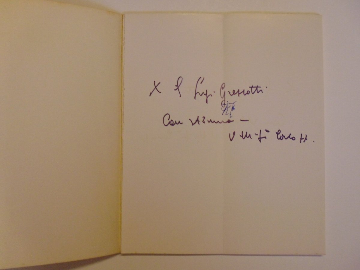 AA VV (a cura di), Vittorio Maria Di Carlo Magalini Editrice, Brescia, 1976, cm. 27x23; pp. n. n.; tavole f. t. a col. e in b. n. Cartoncino edit. bianco muto con sovraccoperta edit. ill. in b. n. Condizioni di conservazione Esemplare in ottimo stato di conservazione. Leggere tracce d'uso e qualche segno e brunitura alla sovraccoperta. Incluso il volantino e la cartolina relativi a questa edizione. Dedica ed autografo del pittore alla prima bianca, la quale è stata però strappata via (vedi foto). SETT13.L20534G