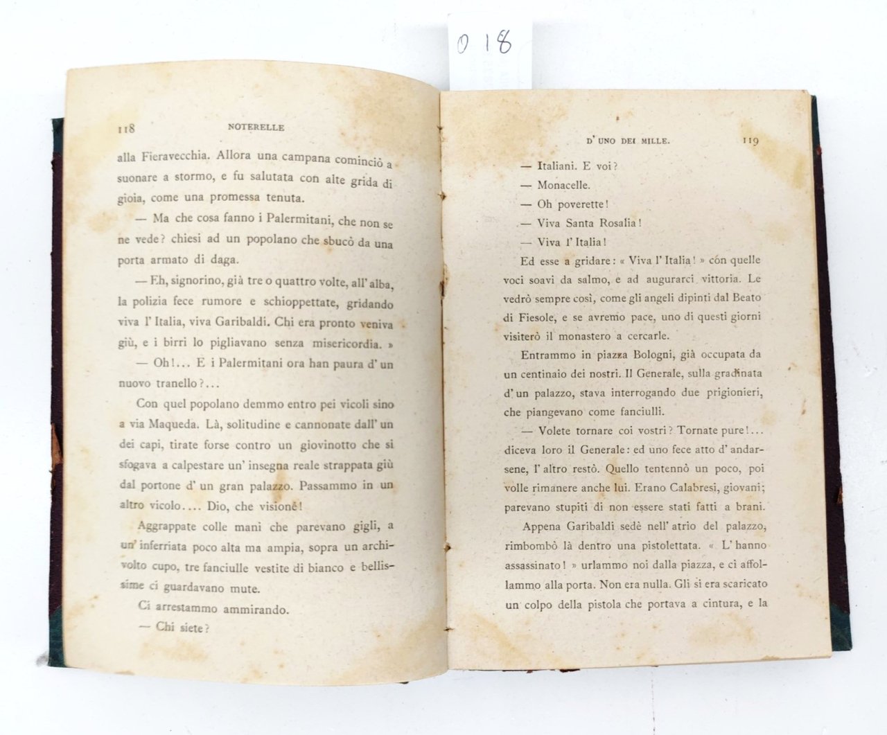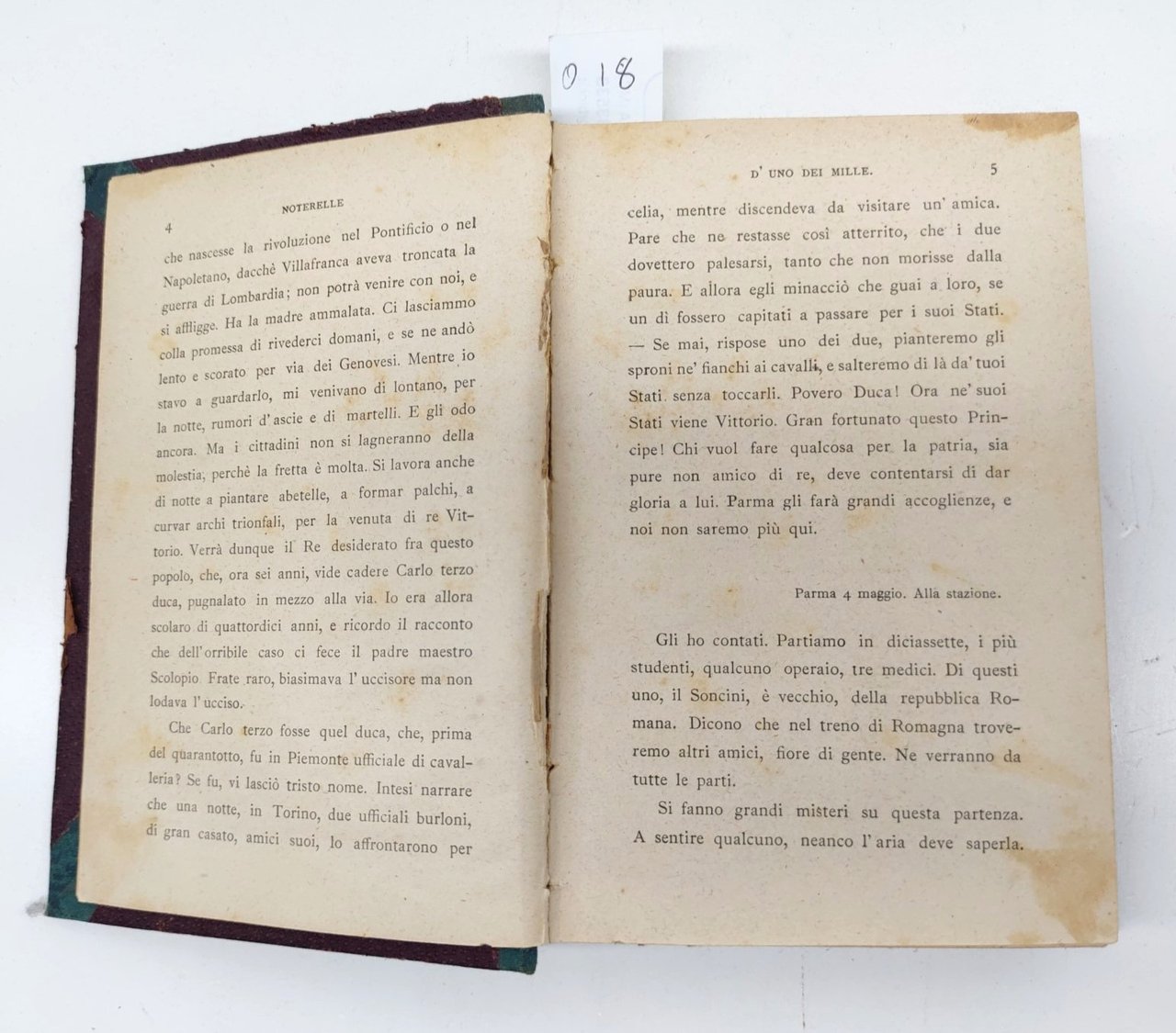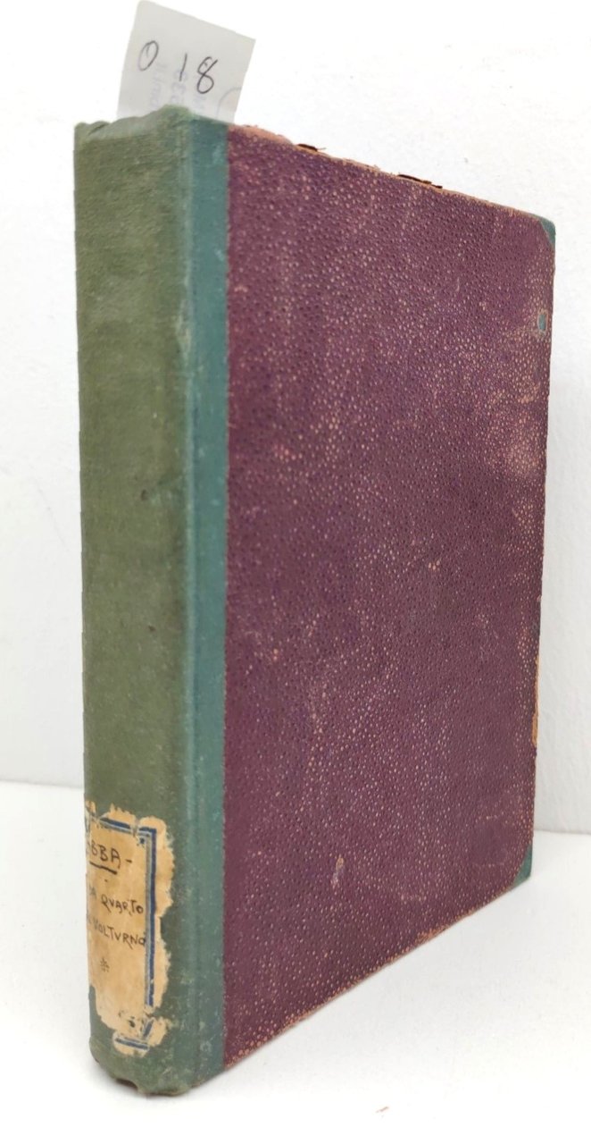 Da quarto al Volturno noterelle di uno dei milleg. c. Abba quarta edizione Zanichelli editore 1899. pp. 302 cm. 18 x 12. edizione di 302 pagine, con l'aggiunta di due scritti carabinieri genovesi a Calatafimi, le guide dei mille. Curiosa e insolita edizione priva del frontespizio a stampa che Ë sostituito da un titolo manoscritto, edizione da studiare, legatura in tela rigida bicolore, dorso in verde con punte piatti in marrone. Legatura leggermente sciupata e con piccole mancanze, pagina 4 parzialmente staccata, pagine con leggere fioriture che non disturbano il testo, manca il frontespizio. Tassello al dorso con titolo manoscritto, manca il frontespizio a stampa, ma Ë presente un titolo manoscritto con scrittura coeva