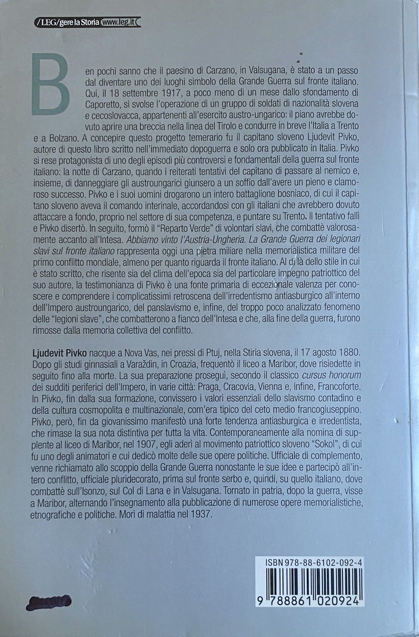 Ben pochi sanno che il paesino di Carzano, in Valsugana, è stato a un passo dal diventare uno del luoghi simbolo della Grande Guerra sul fronte italiano. Qui, Il 18 settembre 1917, a poco meno di un mese dallo sfondamento di Caporetto, si svolse l'operazione di un gruppo di soldati di nazionalità slovena e cecoslovacca, appartenenti all'esercito austro-ungarico: il piano avrebbe dovuto aprire una breccia nella linea del Tirolo e condurre in breve l'Italia a Trento e a Bolzano. A concepire questo progetto temerario fu il capitano sloveno Ljudevit Pivko, autore di questo libro scritto nell'immediato dopoguerra e solo ora pubblicato in Italia. Pivko si rese protagonista di uno degli episodi più controversi e fondamentali della guerra sul fronte italiano: la notte di Carzano, quando i reiterati tentativi del capitano di passare al nemico e, insieme, di danneggiare gli austroungarici giunsero a un soffio dall'avere un pieno e clamoroso successo. Pivko e i suoi uomini drogarono un intero battaglione bosniaco, di cui il capi tano sloveno aveva il comando interinale, accordandosi con gli italiani che avrebbero dovuto attaccare a fondo, proprio nel settore di sua competenza, e puntare su Trento. Il tentativo fallì e Pivko disertò. In seguito, formò il Reparto Verde di volontari slavi, che combatté valorosamente accanto all'Intesa. Abbiamo vinto l'Austria-Ungheria. La Grande Guerra del legionari slavi sul fronte italiano rappresenta oggi una pietra miliare nella memorialistica militare del primo conflitto mondiale, almeno per quanto riguarda il fronte italiano. Al di là dello stile in cui è stato scritto, che risente sia del clima dell'epoca sia del particolare impegno patriottico del suo autore, la testimonianza di Pivko è una fonte primaria di eccezionale valenza per conoscere e comprendere i complicatissimi retroscena dell'irredentismo antiasburgico all'interno dell'Impero austroungarico, del panslavismo e, infine, del troppo poco analizzato fenomeno delle legioni slave, che combatterono a fianco dell'Intesa e che, alla fine della guerra, furono rimosse dalla memoria collettiva del conflitto.