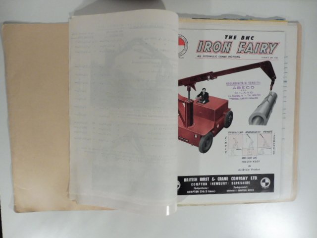 In 4 (cm 24 x 30) con 15 fogli dattiloscritti con preventivi e 14 fogli e pieghevoli pubblicitari illustrati (fogli ad una faccia o pieghevoli di piu' facciate). I pieghevoli sono in italiano, inglese, francese, tedesco. Cartella delle automotrici, gru, betoniere, macchine per l'industria e l'edilizia della Abeco.