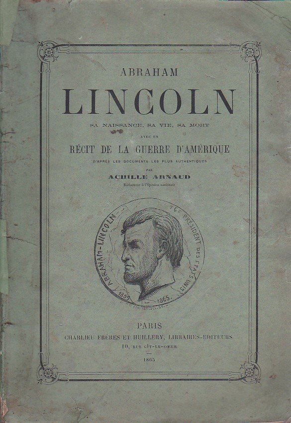 In-4°, pp. 96, brossura editoriale verde pistacchio con ritratto in medaglione di Lincoln entro bordura ornamentale. Illustrazioni xilografiche n.t. e a p. pag., tra cui una carta geografica degli Stati che furono teatro della Guerra Civile e un ritratto a pag. intera di Lincoln. Una vasta gora interessa la metà inferiore di quasi tutto il volume; tracce d'uso. Esemplare da studio. Edizione originale della prima biografia francese dedicata a Lincoln, immediatamente posteriore al suo assassinio (quello che molti storici reputano il massimo Presidente americano era stato ucciso il 15 aprile 1865 al Ford Theatre di Washington dall'attore John Wilkes Booth). L'Arnaud era redattore del giornale 'LOpinion Nationale'. Sabin, 2056. Gilder, p. 149.