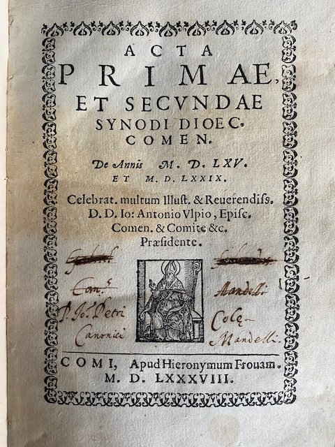 In-4° (cm. 20,5), legatura coeva rimontata in piena pergamena flessibile con titolo manoscritto al dorso e al taglio (antiche scritte e segni d'uso, risguardi successivi); pp. [20] 142 [2]; 191 [1] con stemma episcopale inciso in legno a piena pagina su due carte, frontespizio incorniciato e con vignetta xilografica raffigurante il vescovo; antica firma di appartenenza al frontespizio; lievi bruniture e sporadici segni di tarlo marginali. Edizione originale dell'opera che racchiude i documenti dei primi due sinodi della diocesi di Como. Cfr. Edit-16 12881. Esemplare più che discreto. (NJ3)