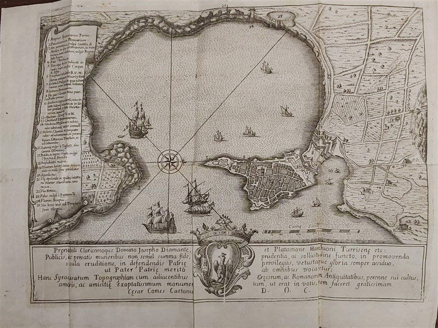 in-4, pp. (6), 147, leg. p. perg. coeva con tit. mss al d. Gr. tav. ripiegata in antip. raff. la città di Siracusa con 25 rimandi. Con diverse incis. xilogr. n.t. Narrazione della vita della Santa protettrice della città di Siracusa. Testo latino, greco e italiano. Bell'esempl. [502]