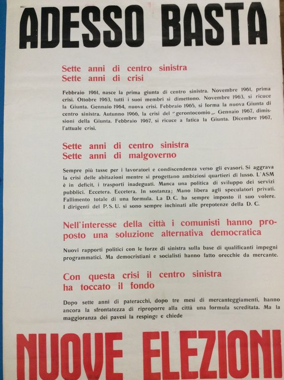 Manifesto originale (cm. 100x70), titoli in nero e rosso su fondo bianco. Propaganda politica pavese per le elezioni del maggio 1968. Febbraio 1961 nasce la prima giunta di centro sinistra. Novembre 1961, prima crisi. Ottobre 1963, tutti i suoi membri si dimettono. Novembre 1963, si ricuce la Giunta. Gennaio 1964, nuova crisi.. Dicembre 1967, l'attuale crisi.. Fallimento totale di una formula. La D.C. ha sempre imposto il suo volere. I dirigenti del P.S.U. si sono sempre inchinati alle prepotenze della D.C.. Con questa crisi il centro sinistra ha toccato il fondo. Dopo sette anni di pateracchi. dopo tre mesi di mercanteggiamenti, hanno ancora la sfrontatezza di riproporre alla città una formula screditata. Ma la maggioranza dei pavesi la respinge e chiede NUOVE ELEZIONI.Picc. mancanze e lievi strappetti marginali, altrimenti ben conservato.