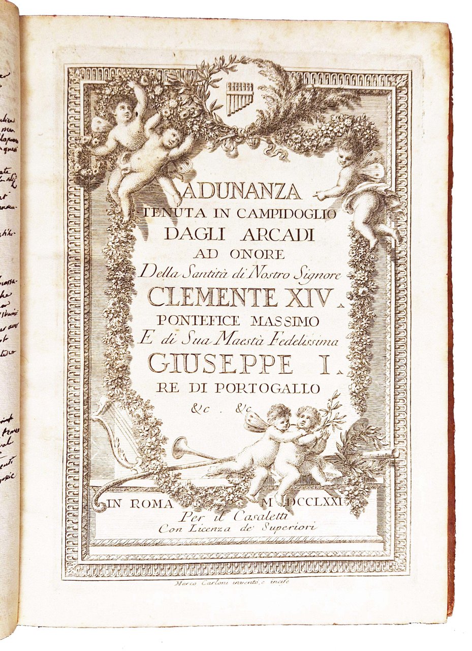 Adunanza tenuta in Campidoglio dagli Arcadi ad onore della Santità di Nostro Signore Clemente XIV. Pontefice Massimo e di Sua Maestà fedelissima Giuseppe I. Re di Portogallo & c. & c.