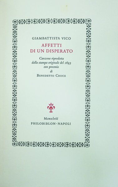 In-8, mz. pergamena editoriale, marchio dell'editore (disegnato da Bruno Bramanti) in oro al piatto anter., astuccio, pp. 21 (proemio di Croce), (3),12 di facsimile (prima edizione della canzone). Unito un foglio volante con la riproduzione in nero dello stesso disegno impresso in oro al piatto, di Claudio Bonacini, ricavato dall'emblema dell'Accademia napoletana degli Uniti alla quale Vico venne aggregato nel 1692 con il titolo di Raccolto.Cfr. Cat. Mardersteig,83. Impressa per Costantino del Franco (e pubblicata a Napoli da Philobiblon), l'edizione fu tirata in 200 esemplare numerati, su carta a tino di Fabriano; la stampa fu eseguita a Verona col torchio dell'Officina Bodoni di Giovanni Mardersteig. Il ns., n. 53, è in ottimo stato.