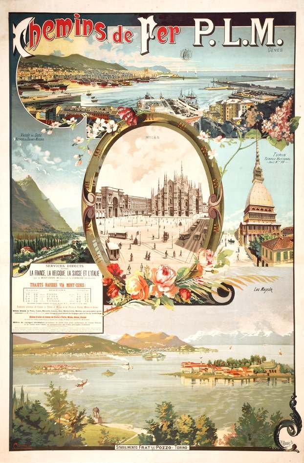 >Manifesto litografico, intelato, cm. 116x83 (compresi i margini bianchi). Manifesto che pubblicizza le ferrovie che percorrono la Francia, il Belgio, la Svizzera e l'Italia, attraverso il Moncenisio e Ventimiglia. Le tratte erano da Calais a Torino e Milano (raffigurata in un grande ovale centrale) e da Parigi a Torino, Milano e Roma. Esemplare ben conservato.
