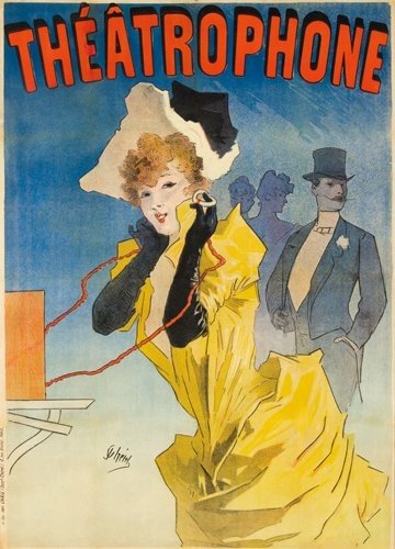 >Manifesto originale, litografia a colori cm. 123x88, intelato. Firmata J. Cheret al centro della parte inferiore del manifesto, francobollo d'affissione sullo sfondo azzurro sopra il cappello della modella. In primo piano una delle modelle più caratteristiche dei manifesti di Cheret. L'elegante signora con lunghi guanti neri, avvicina gli auricolari per ascoltare la musica. Dietro di lei un uomo con cappello a cilindro aspetta, presumibilmente, il proprio turno, oppure la giovane donna, sullo sfondo due figure femminili. Durante l'esposizione di Parigi del 1881 la Società telefonica cerca di farsi conoscere grazie al teatrophone, strumento che permetteva di ascoltare l'Opera e le pièces teatrali attraverso le linee telefoniche. Chiunque inserisse una monetina nello strumento, installato in alberghi e ristoranti, poteva ascoltare la musica. Il teatrophone può essere considerato l'antenato della TV via cavo; cadde in disuso negli anni '30, con l'affermazione di radio e grammofoni. Manifesto abilmente restaurato ed intelato, nel complesso bell'esemplare. Maitres 33. Cheret 341.