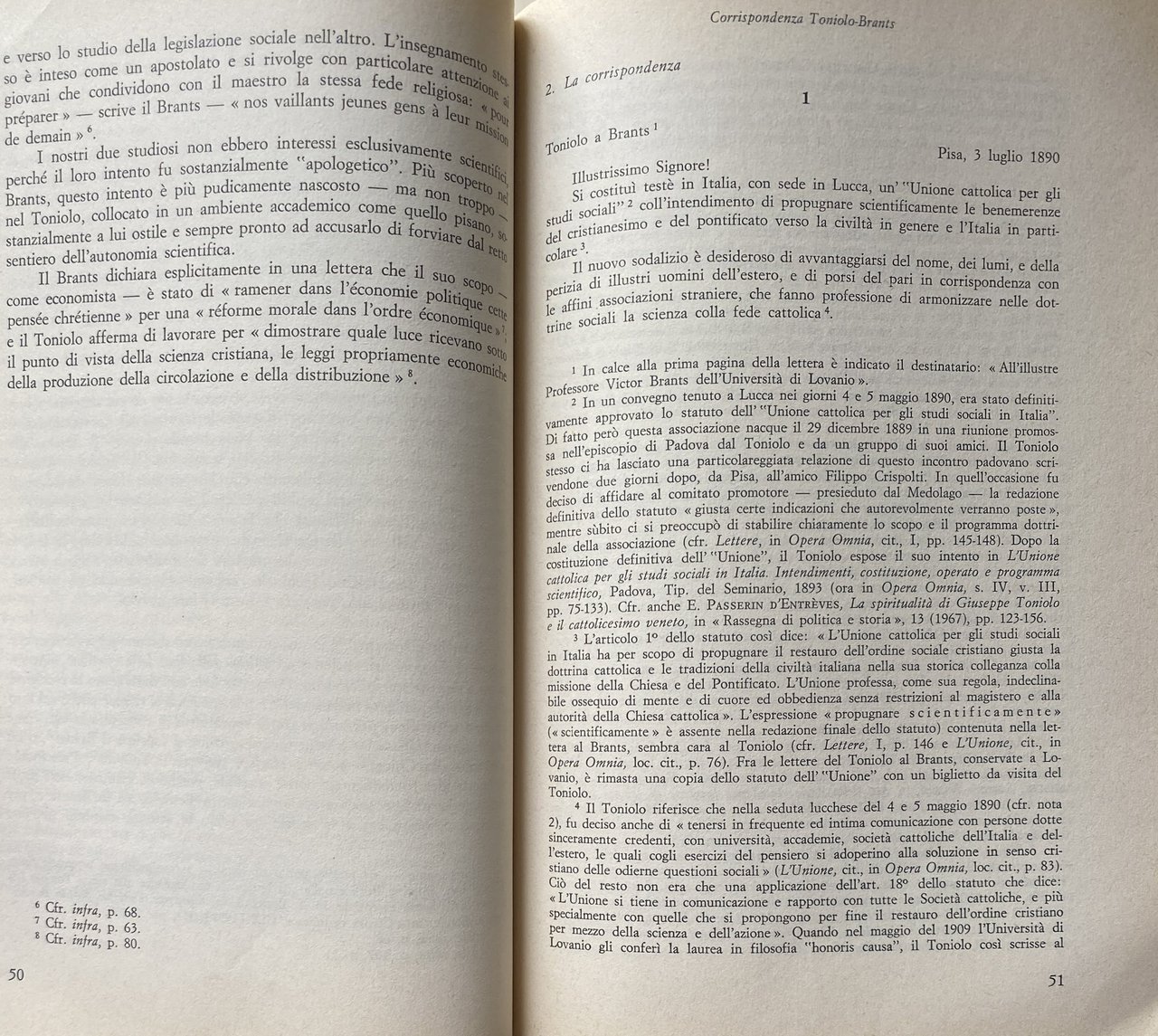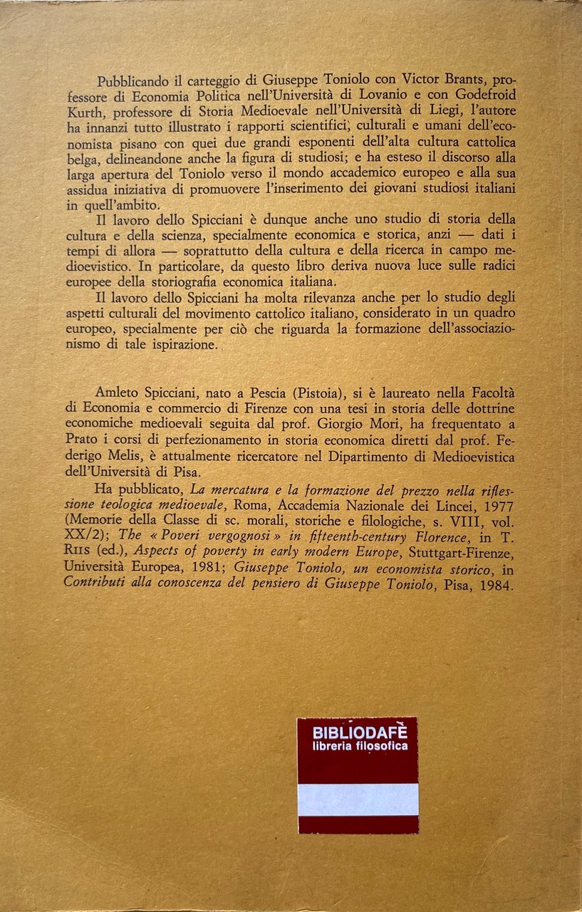 Pubblicando il carteggio di Giuseppe Toniolo con Victor Brants, professore di Economia Politica nell'Università di Lovanio e con Godefroid Kurth, professore di Storia Medioevale nell'Università di Liegi, l'autore ha innanzi tutto illustrato i rapporti scientifici, culturali e umani dell'economista pisano con quei due grandi esponenti dell'alta cultura cattolica belga, delineandone anche la figura di studiosi; e ha esteso il discorso alla larga apertura del Toniolo verso il mondo accademico europeo e alla sua assidua iniziativa di promuovere l'inserimento dei giovani studiosi italiani in quell'ambito. Il lavoro dello Spicciani è dunque anche uno studio di storia della cultura e della scienza, specialmente economica e storica, anzi dati i tempi di allora soprattutto della cultura e della ricerca in campo medioevistico. In particolare, da questo libro deriva nuova luce sulle radici europee della storiografia economica italiana. Il lavoro dello Spicciani ha molta rilevanza anche per lo studio degli aspetti culturali del movimento cattolico italiano, considerato in un quadro europeo, specialmente per ciò che riguarda la formazione dell'associazionismo di tale ispirazione.