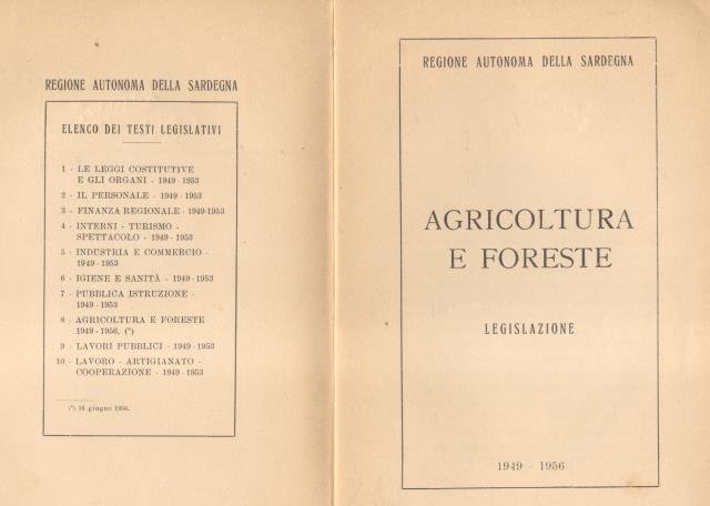 A cura dell'Assessorato Agricoltura e Foreste, 1949-1956. Presentazione di G.Brotzu. Premessa di L.Musio. 16°,pg.16,528. Legatura allentata. Codice libreria 28695.