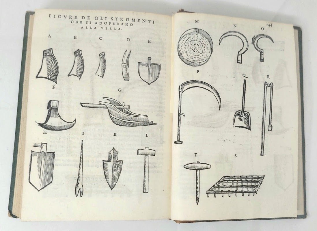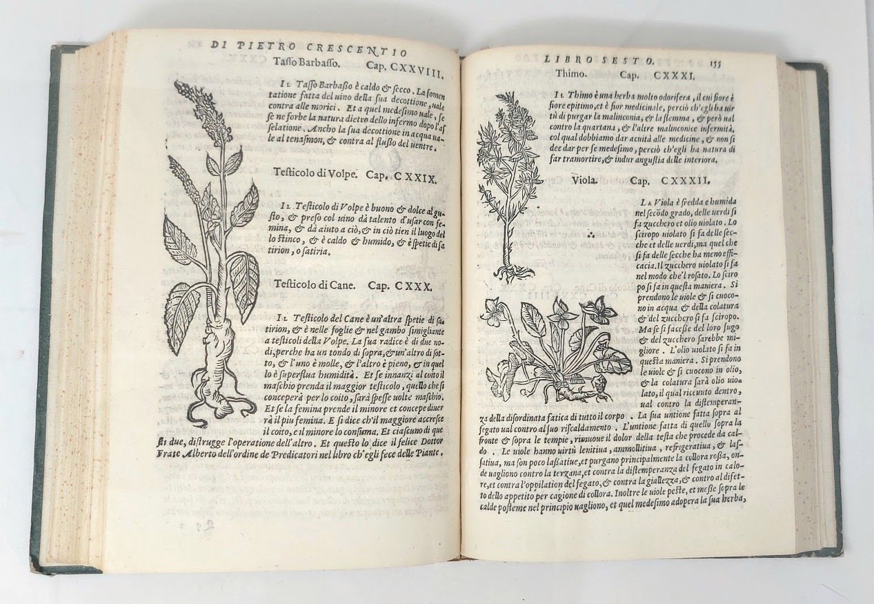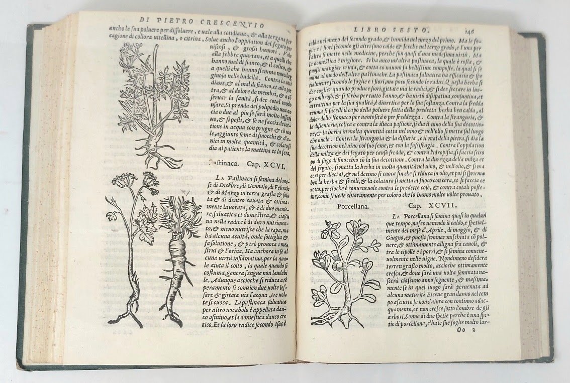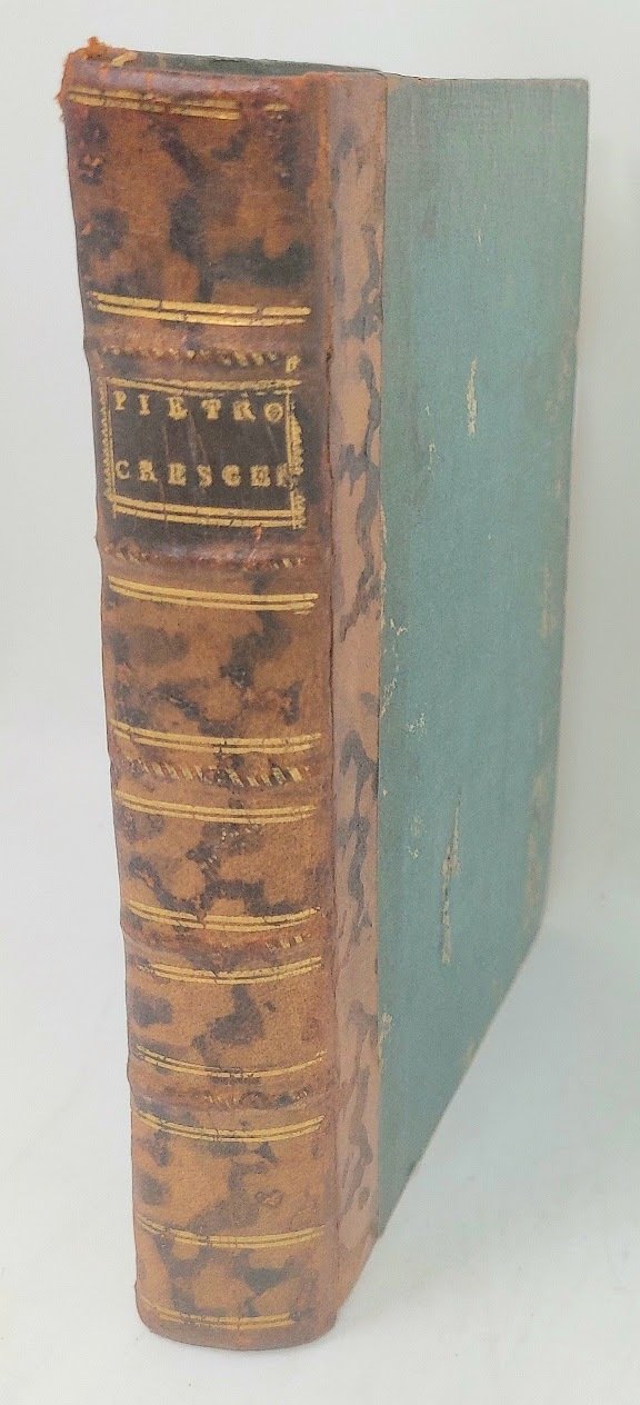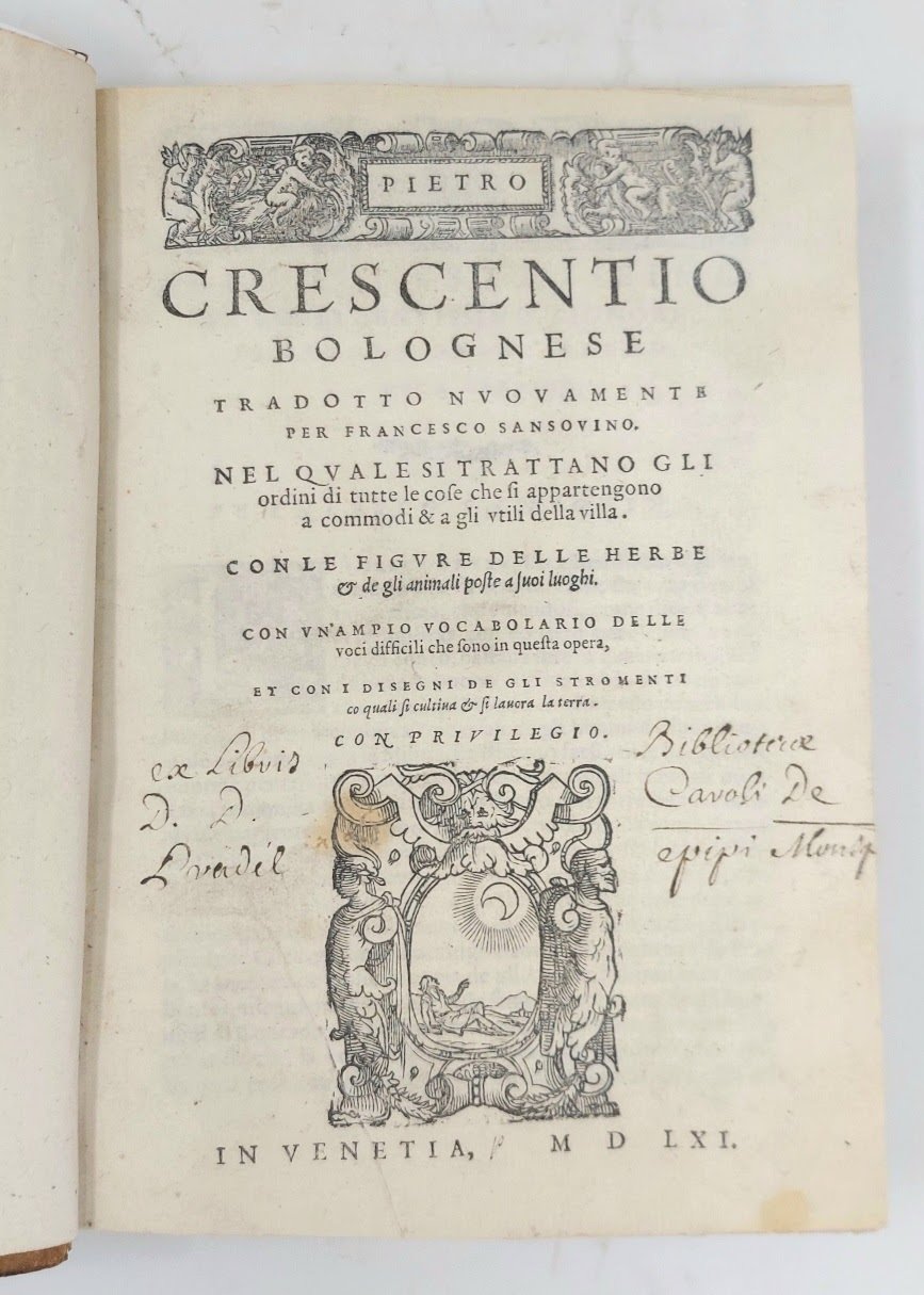 >in-4, ff. (4), 252, (4), con numerose figure xilografiche di fiori, piante, animali e strumenti agricoli. Vari fregi xilografici, testate e finalini, iniziali ornate e istoriate. Legatura 700sca in mezza pelle marmorizzata, dorso a nervi con titolo e fregi oro. Importante edizione in lingua italiana, curata da Francesco Sansovino, del famoso trattato di economia rurale composto dal noto agronomo italiano del medioevo Piero de Crescenzio (1230-1320), profondo conoscitore e studioso dei testi di Catone, Varrone, Palladio, Columella, ed altri, nonché basato sulle sue esperianze naturalistiche personali in quel campo. Vari passaggi sono pure dedicati alla vigna e al vino, nonché alla caccia. Buon esemplare (antiche firme di possesso ms. al titolo). Bing I, 534-535. Ceresoli 184. Simon II, 161..