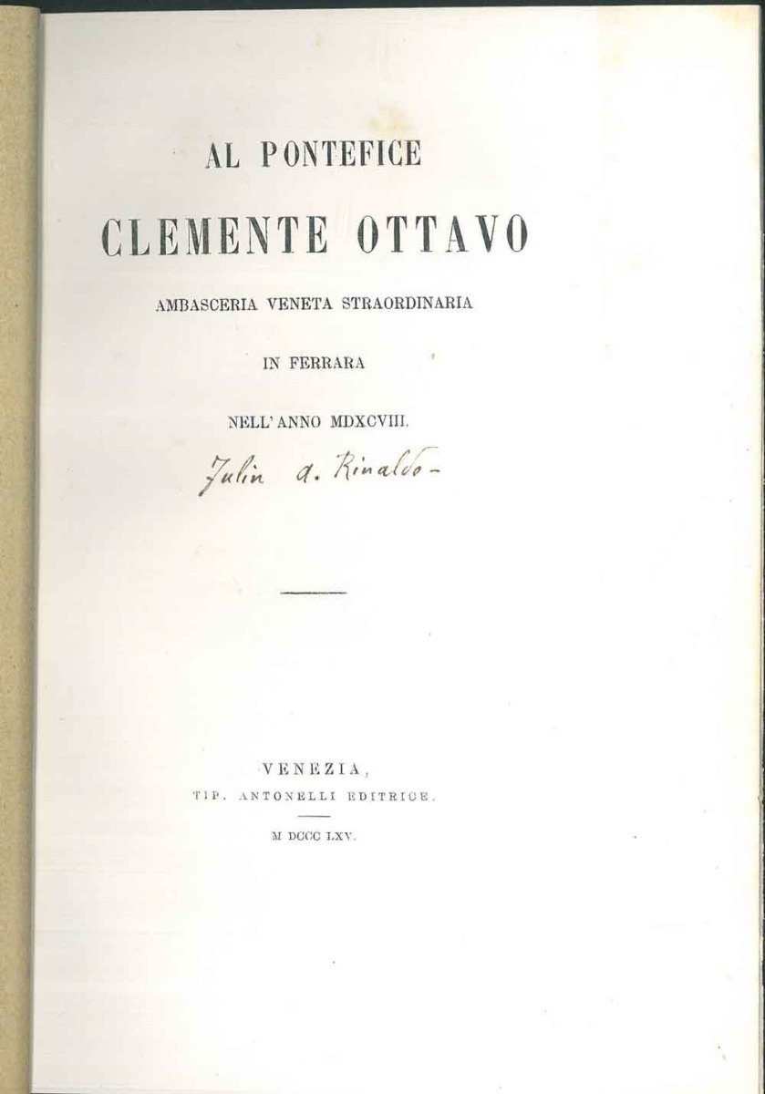 Al pontefice Clemente Ottavo ambasceria veneta straordinaria in Ferrara nell'anno 1698