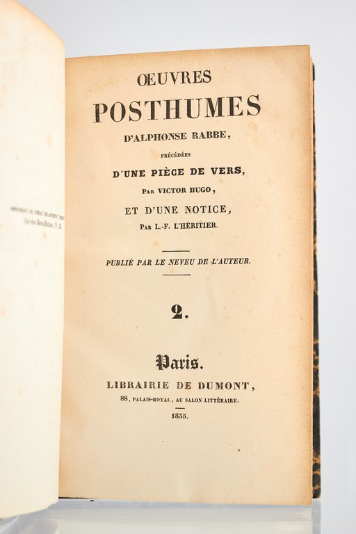 Librairie de Dumont | Paris 1835 | 13 x 20 cm | 2 volumes reliés | [ENGLISH DESCRIPTION ON DEMAND] | Edition originale, très rare. On distingue 3 états : le premier, le nôtre, se distingue par la page de titre intitulée Oeuvres posthumes, comme pour le faux-titre. Le second état substitue une nouvelle page de titre intitulé Album d'un pessimiste, le faux-titre indiquant toujours Oeuvres posthumes (c'est l'état connu et décrit par Clouzot). Le troisième état connaît une nouvelle page de titre à la date de 1836, à nouveau intitulé Album d'un pessimiste, avec le faux-titre oeuvres posthumes (c'est l'état le plus courant) ; par contre la mention d'une notice de L'Héritier a disparu pour laisser la place à la mention d'une notice biographique (extraite de la Biographie universelle de Michaud). La notice de L'Heritier a été ôtée dès le premier état, en effet, de crainte de froisser certains contemporains cités, l'éditeur a préféré ne pas l'insérer. Les oeuvres de Rabbe sont précédés du poème de Victor Hugo : A Alphonse Rabbe, qu'on retrouvera dans Les chants du Crépuscule, parus en 1836. Ces Oeuvres posthumes furent réunies et éditées par le neveu de l'écrivain Charles Rabbe, qui bénéficia pour ce faire d'une subvention du ministère de l'instruction publique. Reliures en demi chagrin noir d'époque. Dos à faux nerfs orné de filets gras à froid. Titre et tomaison dorés. Nom du possesseur en queue : Gauger. Petites traces de frottements en coiffes. 2 coins un peu émoussés. Rousseurs très pâles éparses. Bon exemplaire. Ecrivain noir et sombre, marqué par l'échec et l'inanité des choses, mort en 1829 des excès de l'opium (on ne sait si sa mort fut un suicide ou un dosage malencontreux d'opium), Rabbe enchantera Baudelaire, rencontrera la sollicitude touchante de Victor Hugo, et André Breton ne l'oubliera pas dans son anthologie. Toutes les pages de Rabbe sont pleines d'un romantisme maladif et fiévreux, hantées par le pessimisme et le désespoir dont la principale oeuvre qui fera sa renommée : Philosophie du désespoir, est emblématique de sa profonde mélancolie et de son culte pour la mort. Les essais, commentaire et maximes, poèmes en prose jalonnent ces Oeuvres posthumes, modèle du romantisme noir. On retiendra avec le plus grand intérêt la rareté exceptionnelle de ce tout premier état de l'oeuvre majeure de Alphonse Rabbe inconnu à Clouzot et à la plupart des bibliographes. La Bibliothèque Nationale de France ne possède que le second état, et les catalogues français ne possèdent que des exemplaires à la date de 1836.