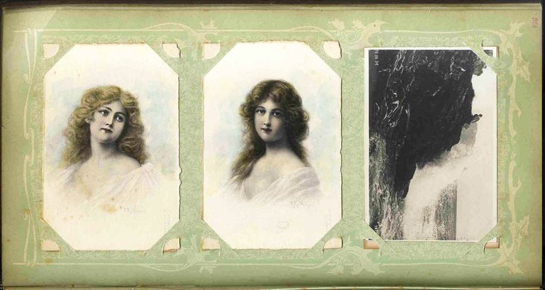 >Delizioso album di grande formato (mm 380x220) con 96 fogli che contengono oltre 550 cartoline di soggetti e tecniche differenti, molte a colori ed alcune dipinte a mano. Elegante e raffinata legatura coeva in velluto con elementi floreali, tutte le pagine sono decorate con motivi vegetali liberty su fondo verde acqua e ciascuna contiene 6 cartoline (3 al recto e 3 al verso), alle sguardie entro tondo scritta "The English Manufactory" e timbro in ceralacca "Società editrice cartoline Torino n.12". Il grande interesse dell'album risiede, oltre che nei gradevoli soggetti, nella varietà delle differenti tecniche adottate: acquaforti, pirografie su cartoncini colorati, fototipie con colorazione a mano, stampa a caldo in rilievo, cromolitografie, fotoincisioni. L'età dell'oro della cartolina illustrata è considerata dal 1898 al 1918: le prime esposizioni tematiche si tengono a Lipsia nel maggio 1898 e a Munich nel luglio 1899. La cartolina Art Nouveau – in cui la donna assume un ruolo molto importante - ha dimensioni fisse (90x140mm) per cui il disegnatore è vincolato da uno spazio limitato. Fino a circa il 1906 un'intera faccia della cartolina era obbligatoriamente riservata all'indirizzo del destinatario, pertanto qualcuno cominciò a scrivere sulle illustrazioni. Proprio per questo gli illustratori crearono degli spazi vuoti accanto alle immagini. In Italia grande diffusione hanno le serie delle "donnine" illustrate da artisti famosi, quali Bianchi, Bompard, Bertiglia, Busi, Corbella, Colombo, Dudovich, Franzoni, Golia, Mauzan, Terzi, Zandrino. La moda femminile italiana segue lo stile di Parigi, mentre in quelle statunitensi, con l'emancipazione, si nota un abbigliamento più funzionale e sportivo. L'anonimo collezionista raccolse e divise per soggetti il materiale tra cui acquaforti con vedute di Amsterdam, pirografie su cartoncino colorato a mano di fiori e animali, vedute di nuvole o paesaggi agresti, fototipie con riproduzioni di dipinti, ritratti, personaggi a cavallo, scene di genere, imbarcazioni, paesaggi marittimi, fiori (spesso con colorazione a mano), animali africani, stampa a caldo in rilievo di soggetti grecizzanti, belle litografie a colori di soggetti di montagna, fotoincisioni su carta litografata di riproduzioni delle vedute di Torino del Theatrum Sabaudiae del 1682 e vedute dei principali monumenti di Roma, litografie a colori di figure femminili. La maggior parte delle cartoline sono "non viaggiate", mentre alcune recano timbri del 1903. Quelle del periodo Art Nouveau, soprattutto femminili e quelle dipinte sono veramente notevoli, ed assai valutate. In ottimo stato di conservazione.