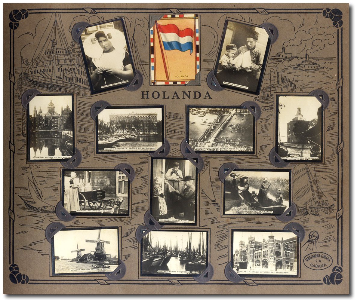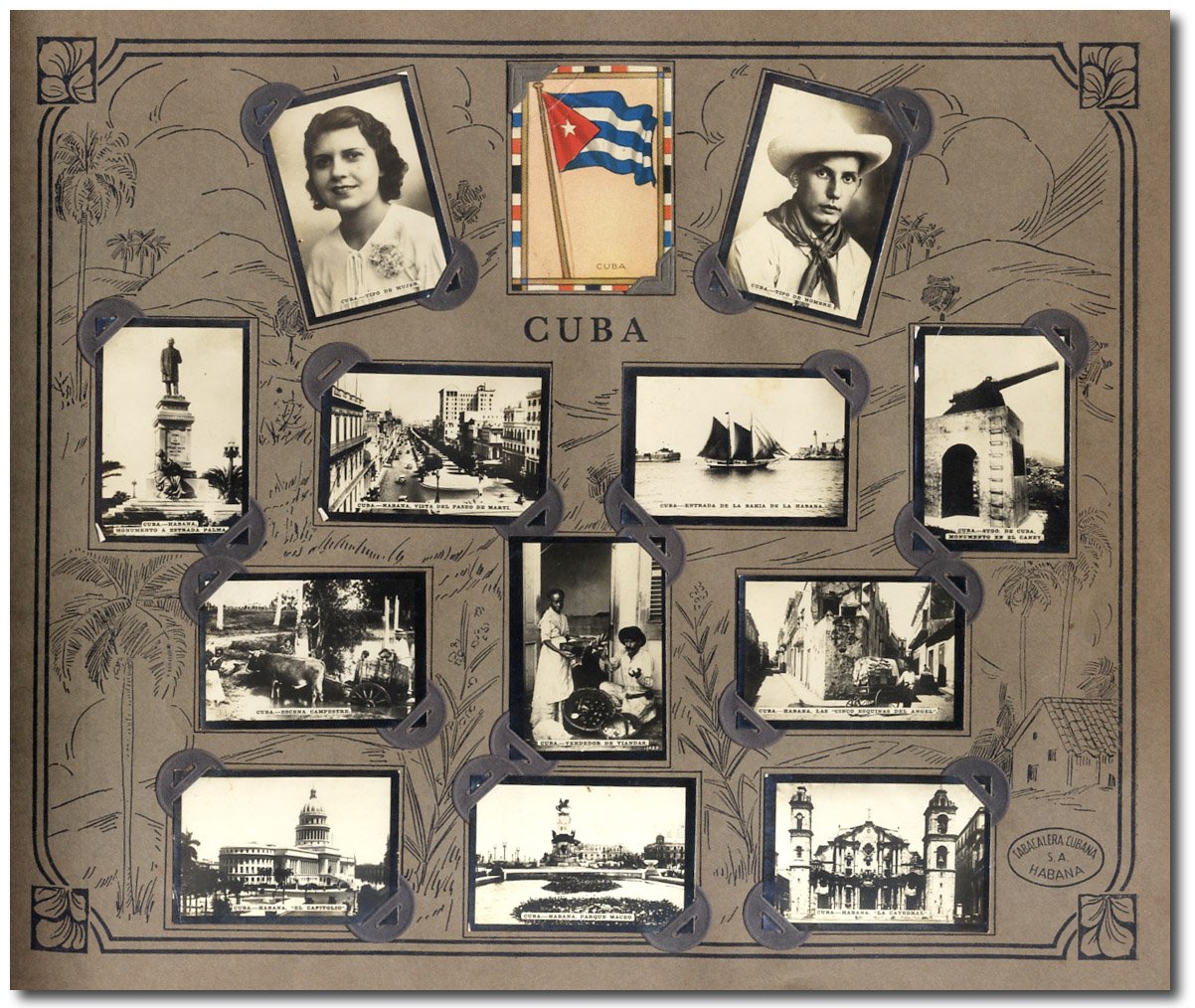 >in-folio oblungo, ff. 66 n.n., completo delle 780 figurine, in fine cromolitografia raffigurante il vascello "Almanaques". Pubblicato nel 1936 a spese della Tabacalera Cubana affinchè "...fumando, pues, estos cigarros, non solamente fumà un producto elaborado con materiales de las memore vegas de Vuelta Abajo...sino que se harà de un instructivo àlbum". Curiosa opera in spagnolo con fini pubblicitari ed educativi: fumando i prodotti della Tabacaelra Cubana era possibile completare questo album geografico dei cinque continenti, ad ognuno dei quali è dedicata una pagina esplicativa ed una carta geografica a piena pagina. Per ogni nazione poi vi sono 13 figurine fotografiche di luoghi, persone, monumenti in bianco e nero e la bandiera a colori, da applicare su pagine con sfondi serigrafati, mentre a fronte vi è una dettagliata descrizione dei confini, caratteristiche del territorio, clima, lingua e principali città. Le nazioni sono per l'Europa: Spagna, Francia, Inghilterra, Italia, Svizzera, Belgio, Olanda, Norvegia, Danimarca, Cecoslovacchia, Svezia, Portogallo, Romania, Polonia, Grecia, Austria, Inghilterra, Bulgaria, Russia, Monaco, Ungheria, Iugoslavia, Albania e Turchia. Per l'Asia: Cina, Giappone, India, Corea, Persia, Siam e Filippine. Per l'Africa: Egitto, Etiopia, Marocco, Sudafrica e Liberia. Per l'America: Cuba, Stati Uniti, Canada, Messico, Groenlandia, Costa Rica, El Salvador, Guatemala, Honduras, Panama, Argentina, Brasile, Ecuador, Colombia, Venezuela, Perù, Cile, Uruguay, Bolivia, Paraguay, Republica Dominicana & Haiti. Per l'Oceania: Australia e Nuova Zealanda. Esemplare in perfetto stato di conservazione ed assolutamente completo di tutte le figurine (antica nota di possesso datata 1937 di Leopoldo Paez al contro piatto anteriore e sue iniziali applicate al foglio del Prologo, insieme ad altri adesivi).