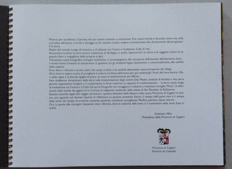 Album Fotografico, Terra Sardegna Provincia di Cagliari, 2007; cm. 24x32, pp. nn (pp 3 di testo); con 37 tavv. a col. a p.pag. con il testo a fronte in italiano, sardo, inglese, giapponese, arabo; legatura spiralata; ed. numerata di 750 es. Condizioni di conservazione Esemplare in buono stato con leggere tracce d'uso; brossura editoriale con leggerissime abrasioni. SETT144.L14310 MT