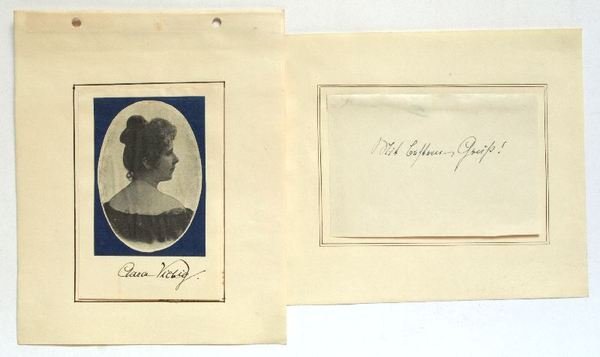 Zusammen (1+1 =) 2 SS. (Qu.-)8vo. Jeweils alt auf Trägerpapier montiert, das Albumblatt zudem mit einem alt montierten Portrait (Zeitungsausschnitt). Der jüdischen Herkunft ihres Gatten Fritz Theodor Cohn wegen zunehmend Repressalien ausgesetzt, zog die populäre Schriftstellerin 1937 nach Brasilien, kehrte 1940 jedoch wieder nach Deutschland zurück und lebte bis zu ihrem Tod in ärmlichen Verhältnissen. Um die Jahrhundertwende zu den meistgelesenen deutschen Schriftstellerinnen zählend, wurde ihren Bühnenstücken niemals der Erfolg zuteil, den sie mit ihren knapp 50 Romanen erzielte.