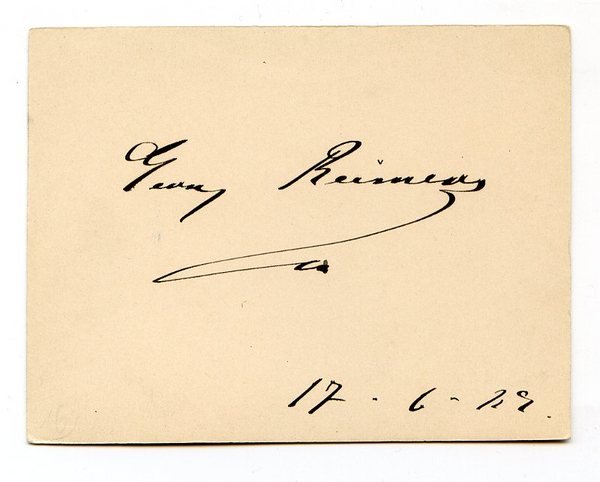 1 S. Qu.-kl.-8vo. Der in Altona geborene Schauspieler gehörte seit 1885 dem Ensemble des Wiener Hofburgtheaters an und wurde 1890 zum Hofschauspieler ernannt. "Zu einem großen runden Geburtstag hatten wir uns alle auf der Burgtheaterbühne versammelt; die Nazizeit warf ihre Schatten voraus, und ein Professor der Germanistik feierte Georg Reimers als einen großen deutschen Schauspieler. Österreich kam in dieser Laudatio schlechtweg nicht vor. Der nächste Redner war damals Ernst Lothar. Er hatte ein vorbereitetes Manuskript, das er während der politischen Ansprache seines Vorredners kaum merklich zerriß. Lothar sprach frei und feierte den Österreicher Georg Reimers. 'Du warst', so sagte er, 'ein Schauspieler dieses Landes, dieser Stadt und dieses Hauses, und du warst mein Herr, wenn du meinen Diener spieltest, und immer ein Diener, wenn du auf der Bühne ein König warst'" (zit. n. Haeusserman, Das Wiener Burgtheater, Wien u. a., Molden, 1975, S. 95).