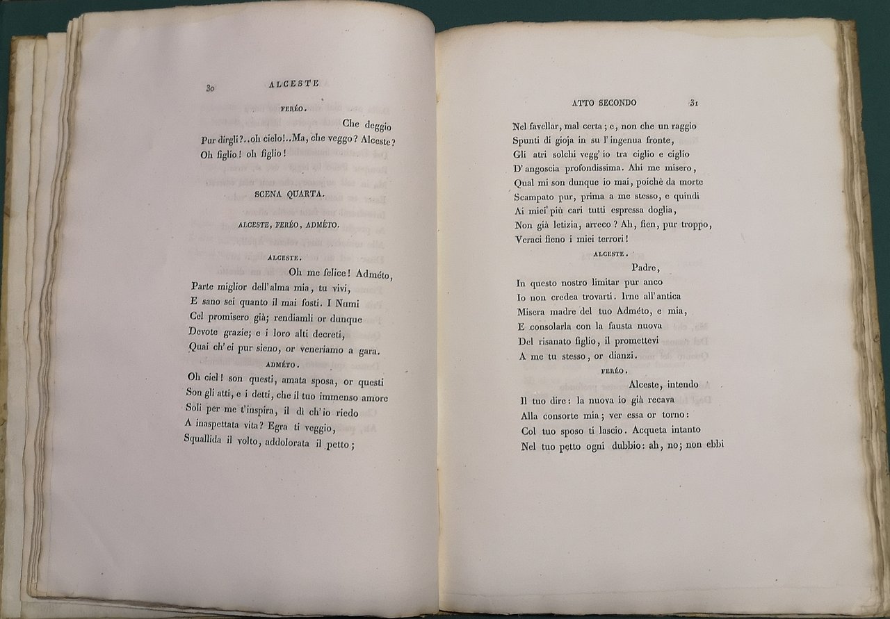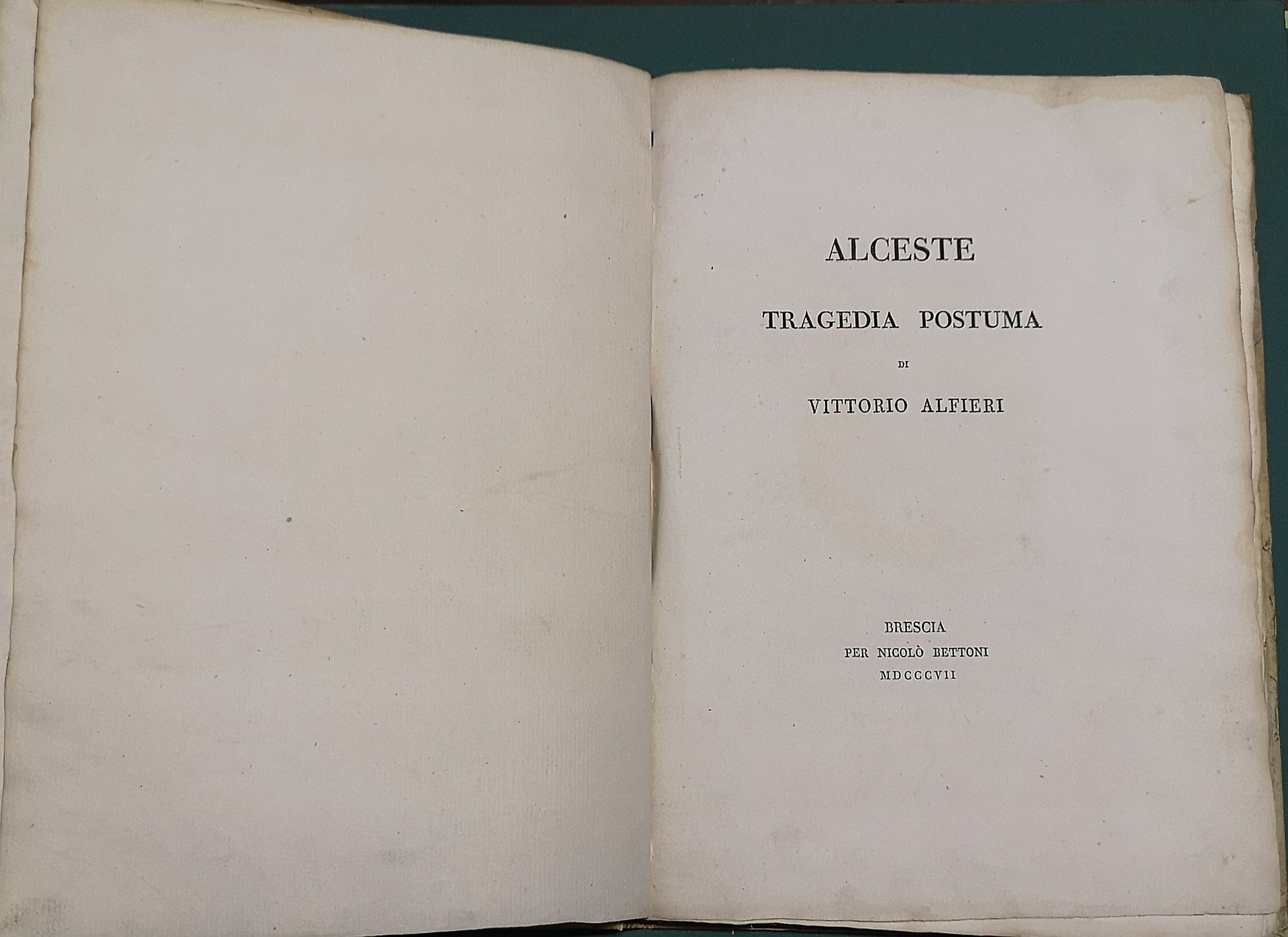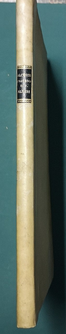 >in-4, pp. (4), 94, (2), leg. m. perg. e ang. Seconda edizione assai ben impressa su carta forte (l'originale era apparsa a Firenze nel 1804). Precede la tragedia una dedica di ''Nicolò Bettoni al Genio di Vittorio Alfieri''. Esempl. a grandi margini. Bustico 97. Fava n. 161: ''Veramente magnifica la stampa, degna del Bodoni''.
