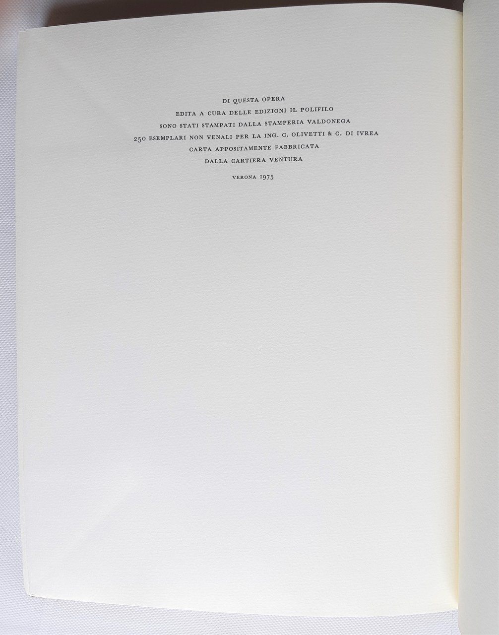Due volumi di questa opera edita a cura delle Edizioni il Polifilo sono stati stampati dalla stamperia Valdoniera 250 esemplari non venali per la Ing C Olivetti e C di Ivrea carta appositamente fabbricata dalla Cartiera Ventura