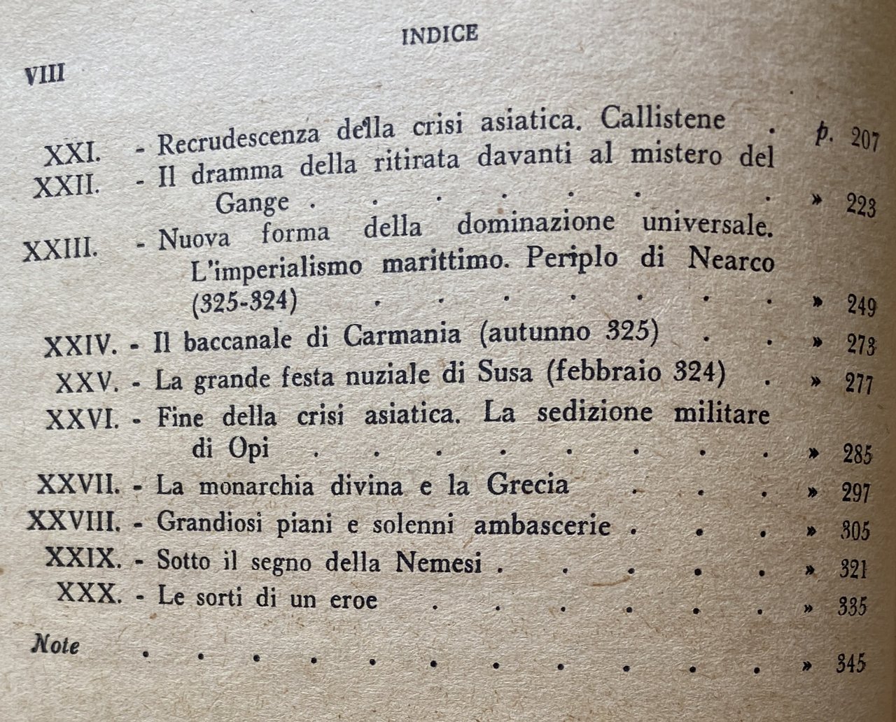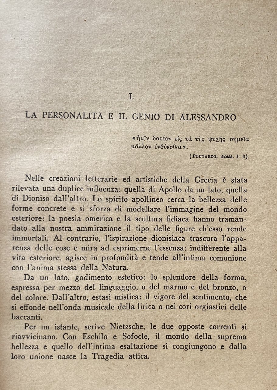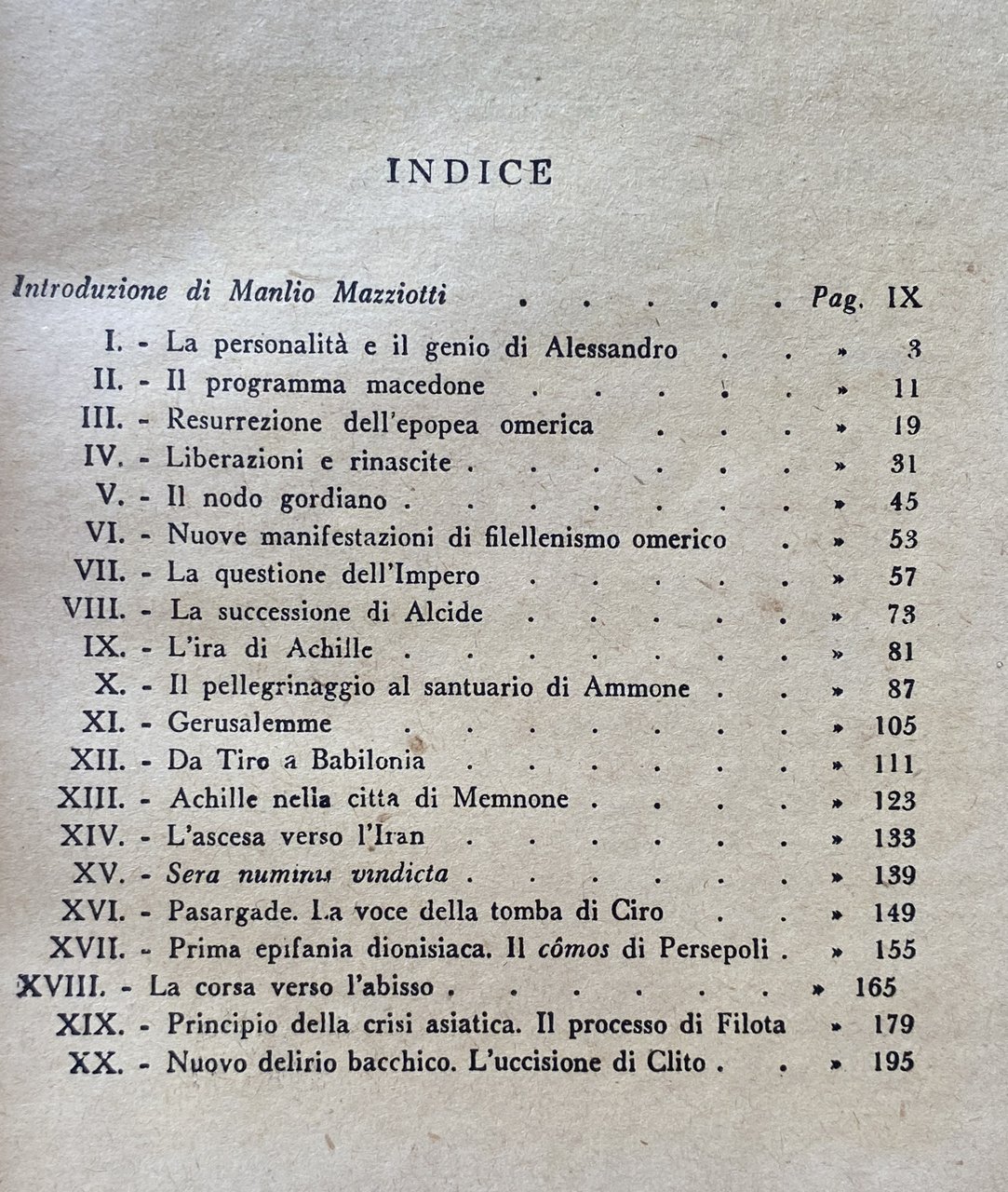 Soggetti: Biografie storiche, Storiografia greca, Storia antica, Condottieri greci, Mitologia, Miti, Vicende storiche, Saggi, Esercito, Conquiste, Battaglie, Impero romano, Guerre, Antichità, Biografia, Contemporanei, Fonti classiche, Bibliografia moderna, Macedonia, Aristotele, Grecia, Impero persiano, India, Babilonia, Civiltà, Culti orientali, Conquistatori, Plutarco, Strabone, Callistene, Filostrato, Filippo, Dario, Serse, Omero, Achille, Patroclo, Dioniso, Politica, Epopea omerica, Epica, Programma macedone, Nodo gordiano, Narrativa, Letteratura, Barbari, Diari, Memorie, Leggende, Discendenza, Eroi mitici, Eracle, Dèi, Divinità, Spedizioni, Personaggi storici, politici, militari, Et Le Monde Grec au temps de Mermnades, Coinage, Finances, Policy, Asia Minore, 362-323 A.C., IV secolo, Alessandria d'Egitto, Re dei Re, Dandamis, Bucefalo, Filosofia, Aneddotica, Diogene di Sinope, Cane, Peritas, Cavallo, Tiro, Libano, Diodoro Siculo, Flavio Arriano, Anabasi, Vite parallele, Quinto Curzio Rufo, Storie, Johann Gustav Droysen, Paul Faure, Vita quotidiana, Eserciti, Gaetano De Sanctis, Lane Fox, Successione, Spartizione, Morte, Nearco, Flavio Arriano, Matrimonio, Nanda, Eschate, Rossane, Samarcanda, Clito, Feste, Celebrazioni, Cerimoniale, Proskýnesis, Corte persiana, Riverenza, Ecbatana, Persepoli, Satrapi, Mazeo, Giardini pensili, Nabucodonosor, Oracolo, Amon, Mitologia egizia, Egitto, Marsa Matruh, Viaggio, Ramses II, Artaserse, Gaza, Gerusalemme, Flavio Giuseppe, Eufrate, Schiavitù, Damasco, Arado, Biblo, Sidone, Cartagine, Ambasciatori, Parmenione, Cavalleria leggera, Battaglia di Isso, Tolomeo, Aristobulo, Gordio, Carro, Giogo, Spada, Chio, Lesbo, Navi, Eubea, Attica, Anatolia, Alicarnasso, Assedio, Mileto, Sardi, Lidia, Democrazia, Corinto, Termopili, Falange macedone, Fanteria, Sarisse, Guerrieri, Spartani, Leonida, Terra bruciata, Tattica militare, Strategia, Tebe, Pindaro, Oracolo di Delfi, Vaticinio, Alcide, Ira, Filota, Gange, Ritirata, Imperialismo marittimo, Carmania, Baccanali, Sedizione, Crisi, Nemesi, Paganesimo, Demostene, Pizia, Atene, Tessaglia, Cinico Diogene, Pausania di Orestide, Dodona, Epiro, Potere, Cheronea, Lega panellenica anti-persiana, Hegemón, Barsine, Megalomania, Personalità, Linothorax, Corazza, Armatura, Pirgotele, Apelle, Tradimenti, Sconfitte, Generali, Regni ellenici, Divisione, Giustino, Vulgata, Efippo di Olinto, Asclepiade, Efemeridi reali, Eumene di Cardia, Felix Jacoby, Newell, Struck, Cilicia, Collezionismo, Riferimento, Consultazione, Libri Vintage fuori catalogo, Tragedia, Baccanti, Spirito apollineo-dionisiaco, Nietzsche, Bellezza, Estetica, Genio militare, Scultura, Armonia, Fidia, Genealogia, Discendenza divina, Koinè, Banchetti, Historical Biographies, Greek Historiography, Ancient History, Greek Leaders, Mythology, Myths, Historical Events, Essays, Army, Conquests, Battles, Roman Empire, Wars, Antiquity, Biography, Contemporaries, Classical Sources, Modern Bibliography, Aristotle, Greece, Persian Empire, Babylon, Civilizations, Oriental Cults, Conquerors, Plutarch, Strabo, Callisthenes, Philostratus, Philip, Darius, Xerxes, Homer, Achilles, Patroclus, Dionysus, Politics, Homeric Epic, Macedonian Programme, Gordian Knot, Fiction, Literature, Barbarians, Diaries, Memoirs, Legends, Ancestry, Mythical heroes, Heracles, Gods, Divinities, Expeditions, Historical, political, military figures, 4th century, Alexandria of Egypt, King, Bucephalus, Philosophy, Anecdotes, Diogenes, Dog, Horse, Tire, Lebanon, Diodorus Siculus, Flavius Arrian, Anabasis, Parallel lives, Quintus Curtius Rufus, Histories, Daily life, Armies, Succession, Partition, Death, Nearchus, Flavius Arrian, Marriage, Roxane, Samarkand, Feasts, Celebrations, Ceremonial, Court, Reverence, Satraps, Mazeus, Hanging Gardens, Nebuchadnezzar, Oracle, Egyptian mythology, Egypt, Journey, Ramses II, Artaxerxes, Jerusalem, Josephus, Euphrates, Slavery, Damascus, Byblos, Sidon, Carthage, Ambassadors, Parmenion, Light Cavalry, Battle of Issus, Ptolemy, Aristobulus, Gordius, Chariot, Yoke, Sword, Chios, Lesbos, Ships, Euboea, Halicarnassus, Siege, Miletus, Sardis, Lydia, Democracy, Corinth, Thermopylae, Macedonian Phalanx, Infantry, Sarisse, Warriors, Spartans, Leonidas, Scorched Earth, Military Tactics, Strategy, Thebes, Pindar, Oracle of Delphi, Prophecy, Alcides, Wrath, Philotas, Ganges, Retreat, Maritime Imperialism, Bacchanalia, Sedition, Crisis, Nemesis, Paganism, Demosthenes, Pythias, Athens, Thessaly, Cynic Diogenes, Pausanias of Orestis, Epirus, Power, Chaeronea, Panhellenic Anti-Persian League, Personality, Cuirass, Armour, Pyrgoteles, Apelles, Betrayals, Defeats, Generals, Kingdoms Hellenic, Division, Justin, Vulgate, Ephippus of Olynthus, Asclepiades, Royal Ephemerides, Eumenes, Collecting, Reference, Consultation, Books out of print, Tragedy, Bacchae, Apollonian-Dionysian spirit, Beauty, Aesthetics, Military genius, Sculpture, Harmony, Phidias, Genealogy, Divine descent, Banquets