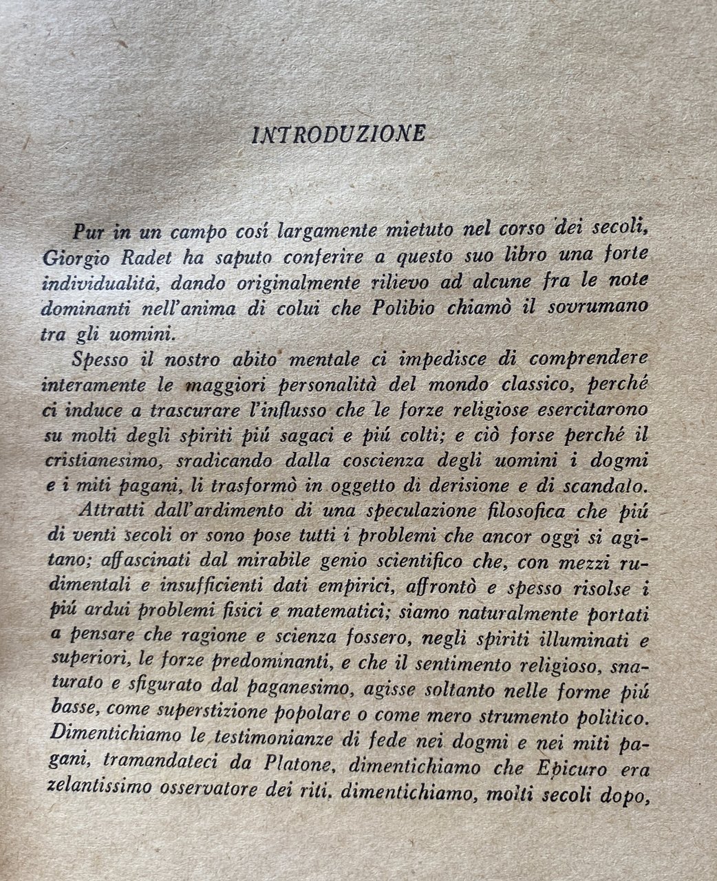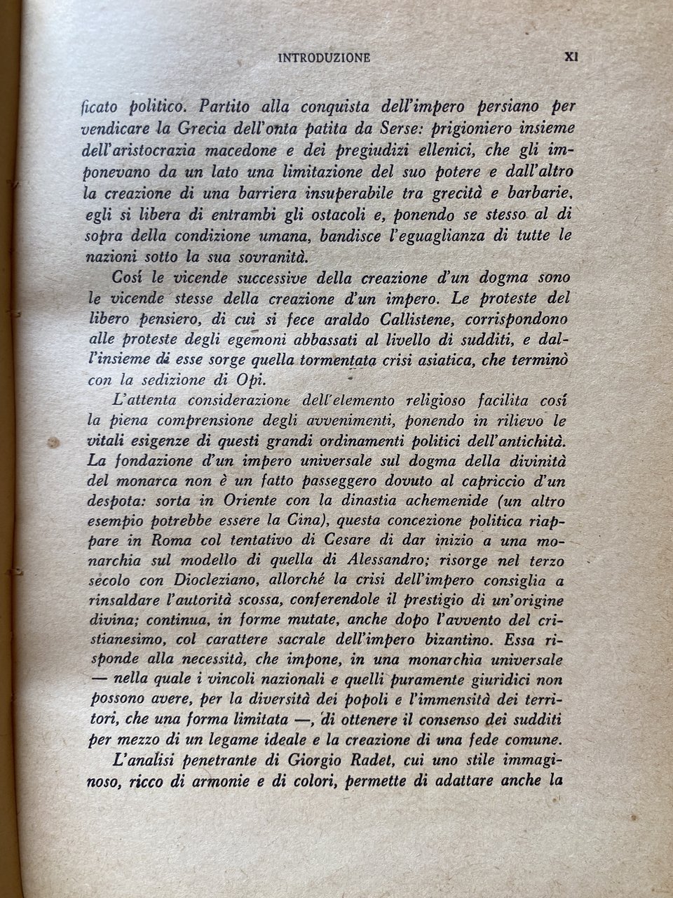 INTRODUZIONE. Pur in un campo così largamente mietuto nel corso dei secoli, Giorgio Radet ha saputo conferire a questo suo libro una forte individualità, dando originalmente rilievo ad alcune fra le note dominanti nell'anima di colui che Polibio chiamò il sovrumano tra gli uomini. Spesso il nostro abito mentale ci impedisce di comprendere interamente le maggiori personalità del mondo classico, perché ci induce a trascurare l'influsso che le forze religiose esercitarono su molti degli spiriti più sagaci e più colti; e ciò forse perché il cristianesimo, sradicando dalla coscienza degli uomini i dogmi ei miti pagani, li trasformò in oggetto di derisione e di scandalo. Attratti dall'ardimento di una speculazione filosofica che più di venti secoli or sono pose tutti i problemi che ancor oggi si agitano; affascinati dal mirabile genio scientifico che, con mezzi rudimentali e insufficienti dati empirici, affrontò e spesso risolse i più ardui problemi fisici e matematici; siamo naturalmente portati a pensare che ragione e scienza fossero, negli spiriti illuminati e superiori, le forze predominanti, e che il sentimento religioso, snaturato e sfigurato dal paganesimo, agisse soltanto nelle forme più basse, come superstizione popolare o come mero strumento politico. Dimentichiamo le testimonianze di fede nei dogmi e nei miti pagani, tramandateci da Platone, dimentichiamo che Epicuro era zelantissimo osservatore dei riti, dimentichiamo, molti secoli dopo, il fanatismo pagano d'un uomo, non certo digiuno di filosofia, Giuliano l'Apostata. Il libro del Radet si oppone a questa critica, che considera uomini ed avvenimenti remoti attraverso i canoni razionali e scientifici del nostro tempo, e tenta di cogliere gli intimi moventi psicologici dei fatti, guardandosi dal respingerne a priori il contenuto fantastico e religioso, anzi ponendolo nella più viva luce. Nessuno più dell'autore di Cybèle, profondo conoscitore dei miti e dei dogmi dell'antichità, poteva essere atto a un simile compito. Nella persona di Alessandro, più che in quella di altri conquistatori, un'immaginazione potente leva il suo volo verso il mondo soprannaturale: leggende popolari e misteri di collegi e di sette, culti animistici e dogmi trascendenti, trovano un'eco profonda nell'anima dell'eroe, in cui l'educazione di Aristotele non ha spento l'innato misticismo, rafforzato dagli impulsi primitivi di un sangue ancor penetrato di vigore barbarico, e tutti si unificano e si ordinano nella concezione superiore di un impero universale governato da un re-Dio.