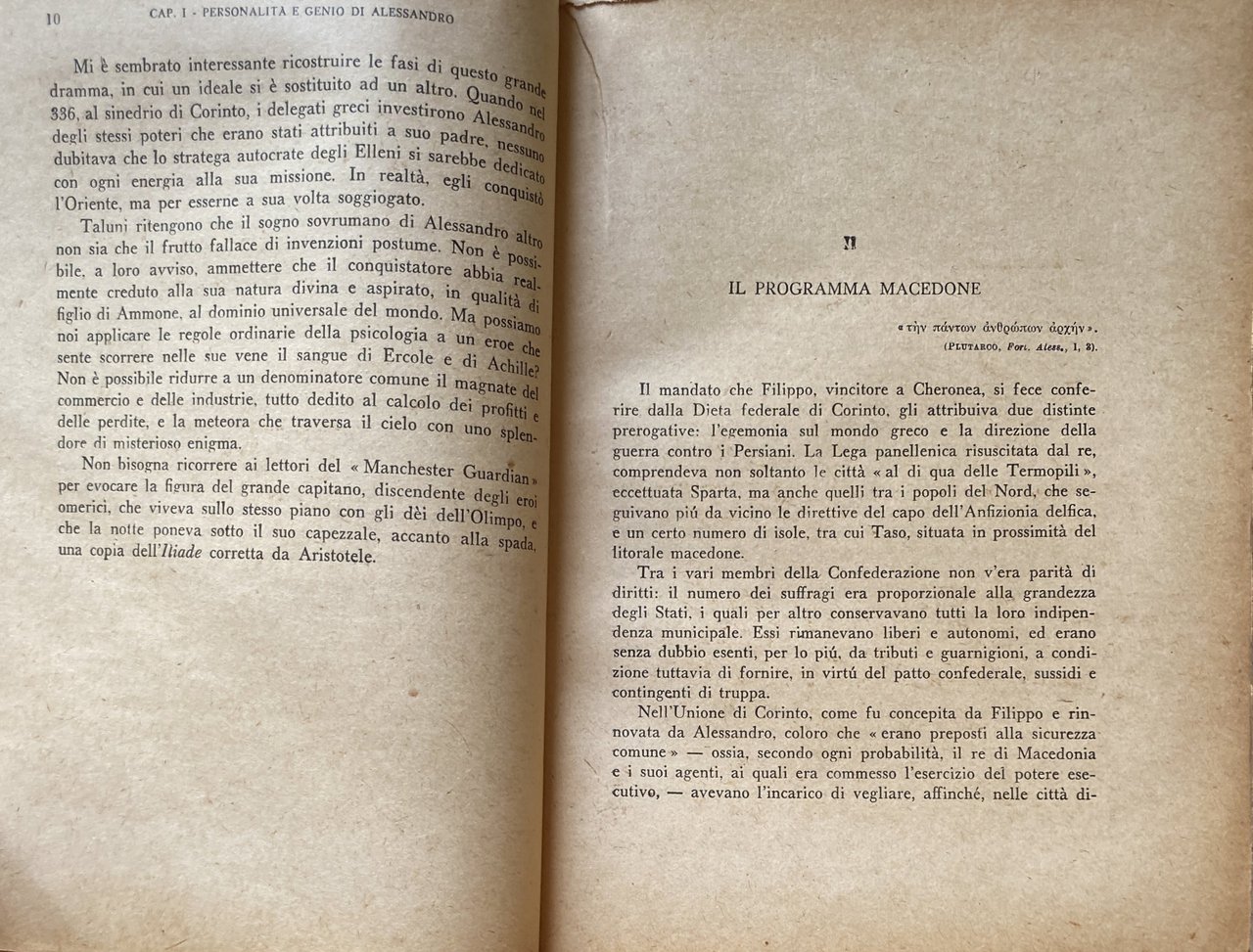 L'autore, seguendo il corso della prodigiosa conquista, dà risalto alle varie fasi attraverso le quali lo stratega-autocrate della lega corinzia esaltò a poco a poco se stesso alla condizione divina: emulazione eroica dinanzi al tumulo d'Achille sulle rive di Troia; vaticinio d'impero universale nello scioglimento del nodo Gordiano; filiazione divina proclamata dall'oracolo di Ammone; consacrazione teocratica a Babilonia; assimilazione della dottrina politica achemenide nelle capitali della Persia; assunzione del carattere di Neos Dionysos durante la campagna d'India; apoteosi finale di Babilonia, allorché tutti, Greci e Barbari, riconobbero la nuova divinità, e Demostene stesso, chinando la fronte dinanzi all'eroe di Cheronea, fece introdurre il figlio di Ammone nel pantheon della democratica Atene. Il riconoscimento universale della natura divina di Alessandro ha per conseguenza necessaria il dominio su tutte le genti. A questo punto, lo slancio mistico del conquistatore assume il suo. significato politico. ...