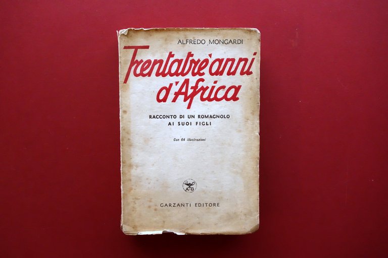 Alfredo Mongardi, Trentatrè anni d'Africa racconto di un romagnolo ai suoi figli con 64 illustrazioni Garzanti, Milano 1940; cm 22,5x15; pp. VIII-316 con 64 tavv. fotografiche in b/n fuori t.; brossura ed. Condizioni di conservazione Complessivamente in buone condizioni con tracce d'uso e del tempo; brossura sgualcita con marginali minimi strappetti e mancanze; leggere bruniture e aloni. Interni buoni con normale lieve ingiallimento dovuto al tipo di carta, prime e ultime pagine con alcune marginali bruniture. SETT21.L26214 N