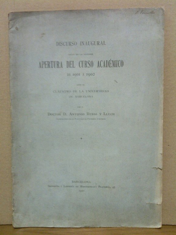 Barcelona: Imp. y Librería de Montserrat, 1901.- 38 p.; 4º mayor (27 x 18,8 cm).* Tras la portadilla una dedicatoria del autor manuscrita a tinta y firmada. Las cubiertas ajadas y con pequeños desgarros en los márgenes. LITERATURA Y FILOSOFÍA MEDIEVALES ESPAÑOLAS
