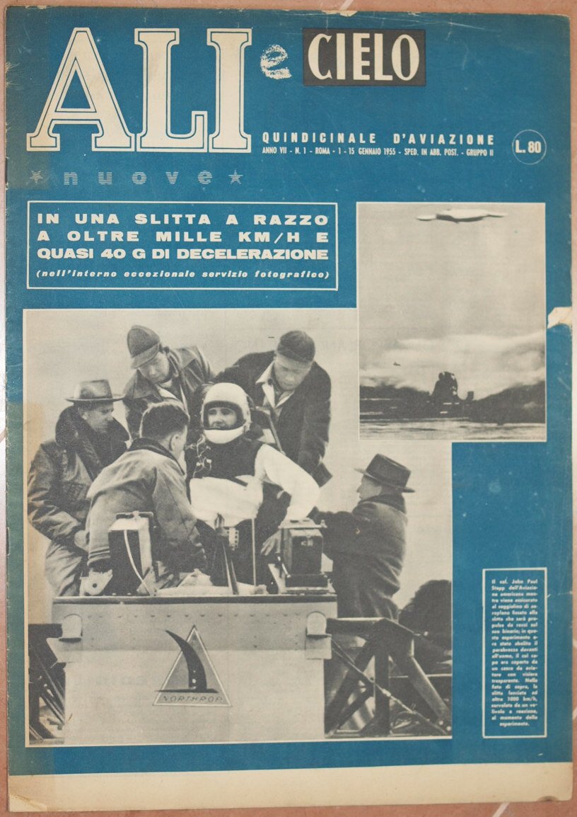 In folio. Dim. 39x27,5 cm. Pp. 16+(4). Numero del 1-15 gennaio 1955 della rivista settimanale "Ali" di aviazione. "Ali" il periodico degli aviatori italiani nasce a Milano il 28 Marzo 1944 per essere pubblicato fino al 28 Aprile 1945 quando si interruppe a causa della guerra. Riappare nel 1951 fino al 1977 variando più volte di nome. Tra gli articoli presenti: Strane sagome nel cielo della sconfitta, La più grande aviorimessa del mondo a Bourget, Aeromodellismo 1954, L'aviatore sul fiume, Formosa Danzica d'Oriente, Al di la dei mille all'ora in una slitta a razzo, Zippy aeromodello da sala, costruitevi un G. 46, Tecnica delle microonde ecc. Numerose notizie di attualità e foto d'epoca all'interno.<BR>In buone condizioni. Copertina editoriale in buone condizioni generali con lievi usure ai margini e dorso. Legatura assente. All'interno le pagine si presentano in ottime condizioni con rare fioriture. Number of the 1-15 of january 1955 of the weekly magazine "Ali" of aviation.<BR>"Ali" the magazine of italian aviators was born in Milan the 28th of March 1944 to be published until the 28th of April 1945 when it was blocked due to the war. It reappeared in 1951 until 1977 changing names different times. Between the articles inside: In the sky of defeat, The biggest deposit of airplanes in Bourget, Airmodelism 1954, Aviator in the river, Formosa Danzica d'Oriente, Al di la dei mille all'ora in una slitta a razzo, Zippy airmodelist, G. 46, tEchnique of microwaves ecc. Different information of actuality and photoes inside. In good conditions. Editorial cover in good general conditions slightly worn in the edges and spine. Binding in good conditions. Inside pages are in good conditions with occasional foxings.