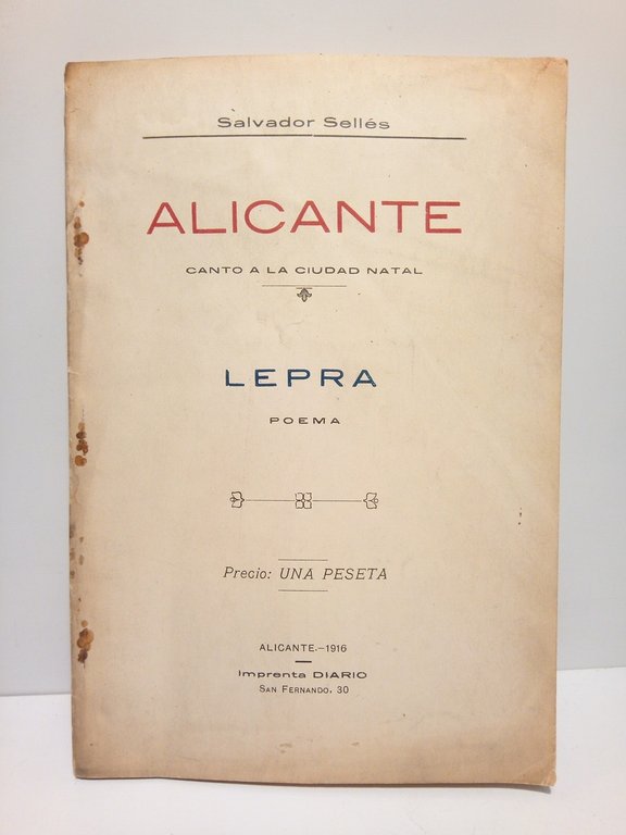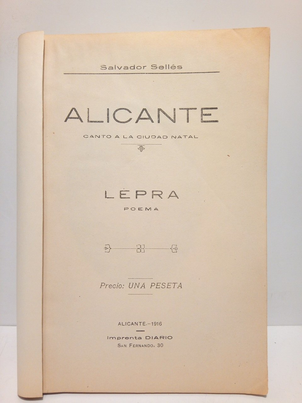 [PRIMERA EDICIÓN ambas obras].- Alicante; Imp. Diario, 1916 (para Alicante) y 1912 (para Lepra).- Las dos obras en un solo VOLUMEN con 58 p 22 p.; 8º mayor (19,5 x 13,5 cm); Rústica Ed.- RARO.* Al estar los pliegos cosidos con grapas metálicas, en torno a éstas tiene una pequeña señal de óxido. Leves ribetes de humedad en las cubiertas y margen superior. Salvador Sellés Gosálvez (1848-1938) fue un poeta alicantino con fuertes influencias del espiritismo y progresismo político. Su obra es esencialmente poética, y aunque inmerecidamente no llegó a tener una gran fama, sí fue de gran importancia en la literatura levantina de su época. VALENCIA