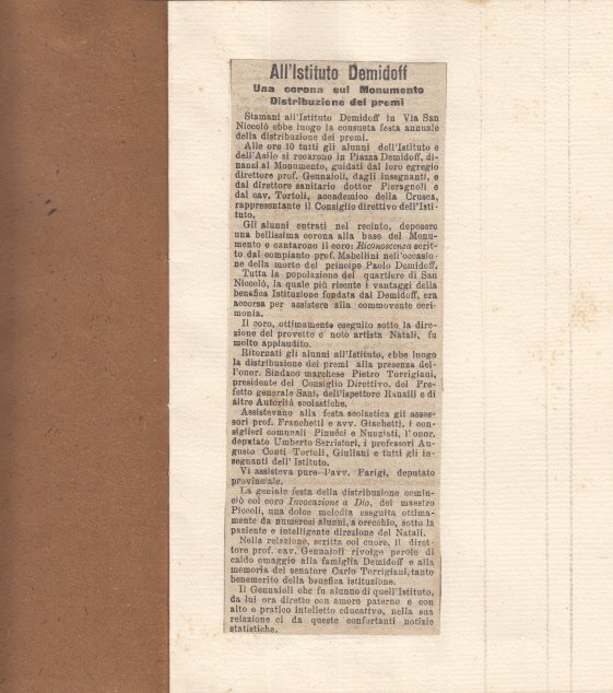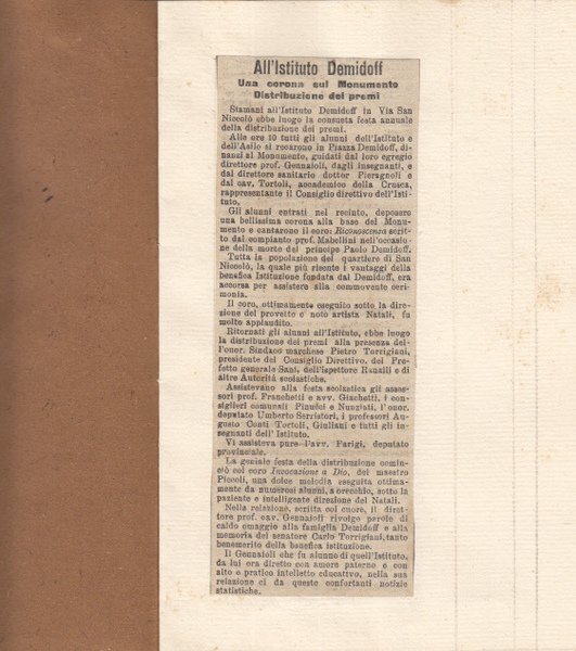 In-16 (Cm 19,5 x 13,5), 4 pagine non numerate con brossura muta, in 3 di esse e' stato attaccato l'articolo ritagliato da "La Nazione" del 1897". Ex libris Pieri Gerini. Curioso espediente per la conservazione e la collezione di questo scritto. Unico ed interessante. Segnetti a matita MOLTO BUONO - L'articolo descrive la posa di una corona presso la statua del principe Paolo Demidoff da parte degli alunni dell'Istituto dell'asilo.