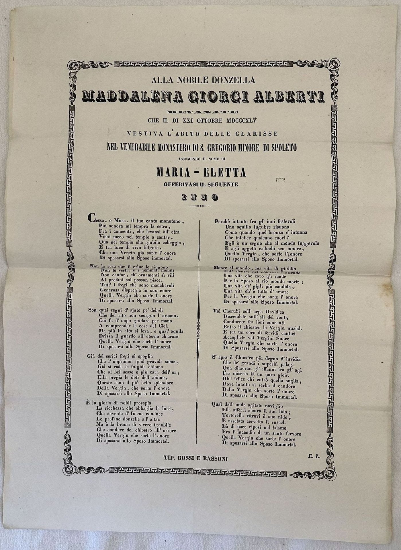 Poema pubblicato su manifesto in onore della nobile Maddalena Giorgi Alberti di Bevagna scritto in occasione della sua vestizione nel Monastero della Clarisse San Gregorio Minore di Spoleto avvenuto il 21 ottobre 1845. Senza data ma del 1845. Testo entro cornice. In buone condizioni. Piegature. Dim. cm 42x30,5. Poem published on manifest in honour of the noblewoman Maddalena Giorgi Alberti from Bevagna written in occasion of her entry in the Monastero della Clarisse San Gregorio Minore of Spoleto the 21st of october 1845. Not dated but of 1845. Text in a frame. In good conditions. Foldings. Dim. cm 42x30,5. <BR><BR>