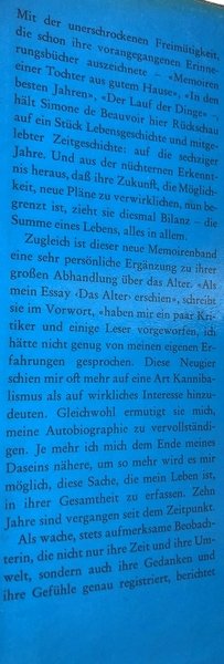 Mit der unerschrockenen Freimütigkeit, die ihre Erinnerungsbücher auszeichnet, hält Simone de Beauvoir Rückschau auf ein Stück Lebens- und Zeitgeschichte: auf die sechziger Jahre. Und aus der nüchternen Erkenntnis heraus, daß die Möglichkeit neuer Pläne nun begrenzt ist, zieht sie Bilanz. Ihre Erinnerungen legen Zeugnis ab von einem lebenslangen Kampf gegen geselleschaftliche Tabus, für Wahrheit und Gerechtigkeit.