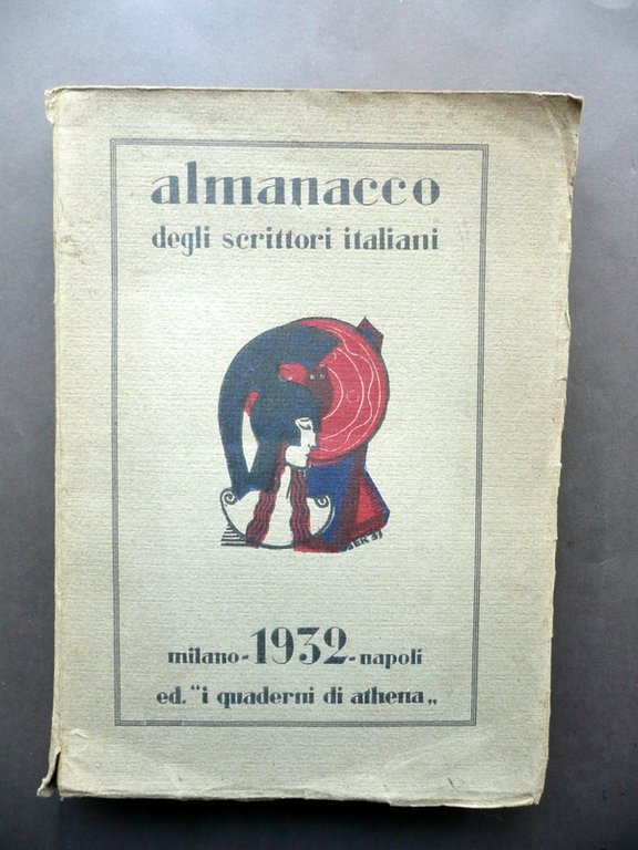 AA. VV., Almanacco degli scrittori italiani 1932 A cura di Dante Giorgio Addeo e Armando Giordano [.] Ed. I Quaderni di Athena", Napoli 1932, cm 25x18, pp. 256 con varie belle ill. xilografiche in b/n nel t., e alcune ill. quasi tutte fotogr. in b/n fuori t.; brossura ed. Copertina con bella grafica a colori di Luigi Servolini (vedi foto). Condizioni di conservazione Esemplare ben conservato con tracce d'uso; margini, angoli delle brossure e cuffie con alcune piccole tracce / accenni di pieghette e minimi strappetti (alle cuffie gli strappetti sono di un paio di cm, vedi foto); cuffia sup. con una trascurabile mancanza. Interni buoni con alcune piccole leggere bruniture; foglio contenente gli errata corrige applicato alla prima bianca; cerniera interna post. in precedenza leggermente aperta con conseguente leggero allentamento delle cuciture di qualche fascicolo, ma restaurata per mezzo d'incollatura; esemplare compatto. Per un elenco degli scrittori italiani partecipanti vedi foto frontespizio. Copertina con bella grafica a colori di Luigi Servolini. SETT124.L12042 N "