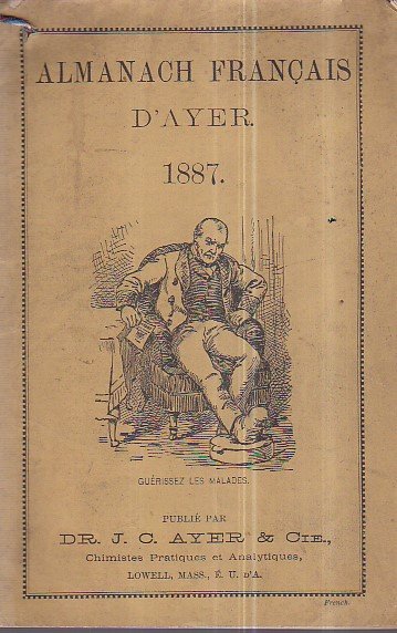 In-8°, pp. 36 nn., brossura editoriale gialla con illustrazione xilografica e cordino laterale. Numerose tabelle e incisioni xilografiche n.t. Buon esemplare. Curioso almanacco medico stampato in francese a Lowell, nel Massachussets, dalla celebre ditta chimico-farmaceutica Ayer, la più prospera che ci fosse allora al mondo, fondata da James Cook Ayer. L'almanacco (che veniva stampato in numerose lingue, conoscendo immensa diffusione) descrive le pillole e i preparati farmaceutici della Ayer descrivendo anche le varie patologie per cui essi erano impiegati.