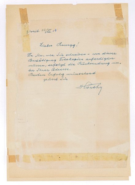 4to and oblong 8vo. Altogether 3½ pp. on 4 ff. Comprises the fragment of an autogr. envelope. To Otto W. Rossegg (1890-1973). - All leaves with the exception of the picture postcard mounted on old backing paper; traces of replaced adhesive tape; letter on very thin paper and wrinkled.